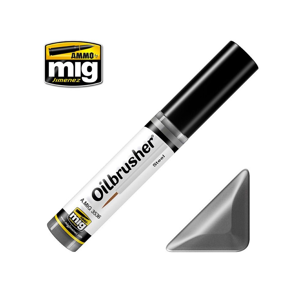 Pomocou nových olejových farieb Oilbrusher môžete naniesť dokonalý kovový povrch. Mnohé časti našich modelov majú povrchovú úpravu z ocele. S týmto odtieňom možno ľahko dosiahnuť realizmus, a to buď priamym použitím, alebo nanesením na iné metalické farby na zmenu tónu.