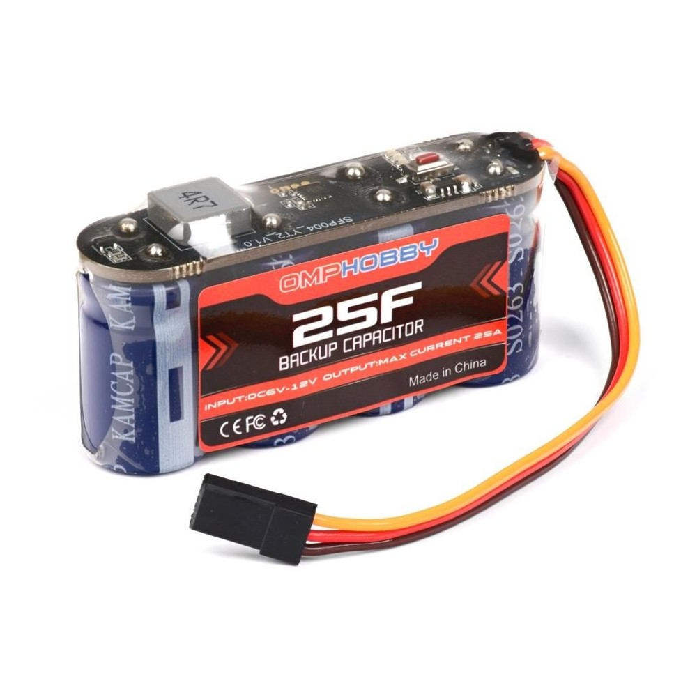 25 F/12 V szűrő szuperkondenzátor készlet a fedélzeti elektronika tápfeszültségének szűrésére/rövid távú tartalékolásához nagy teljesítményű és nagy sebességű szervókat használó modellekben. Ideális RC helikopterekhez és óriás repülőmodellekhez.