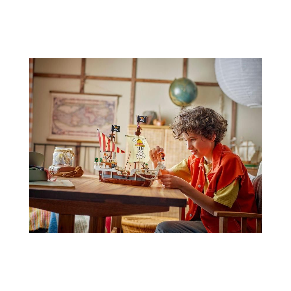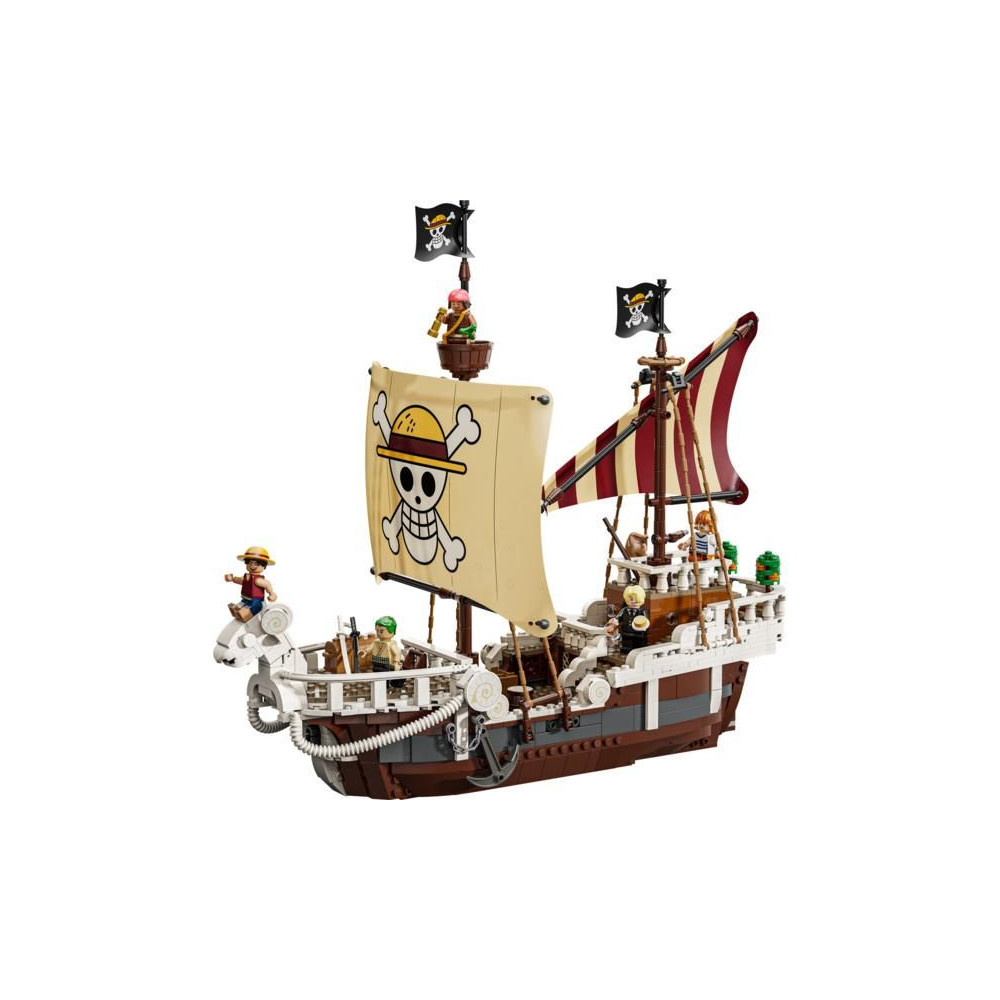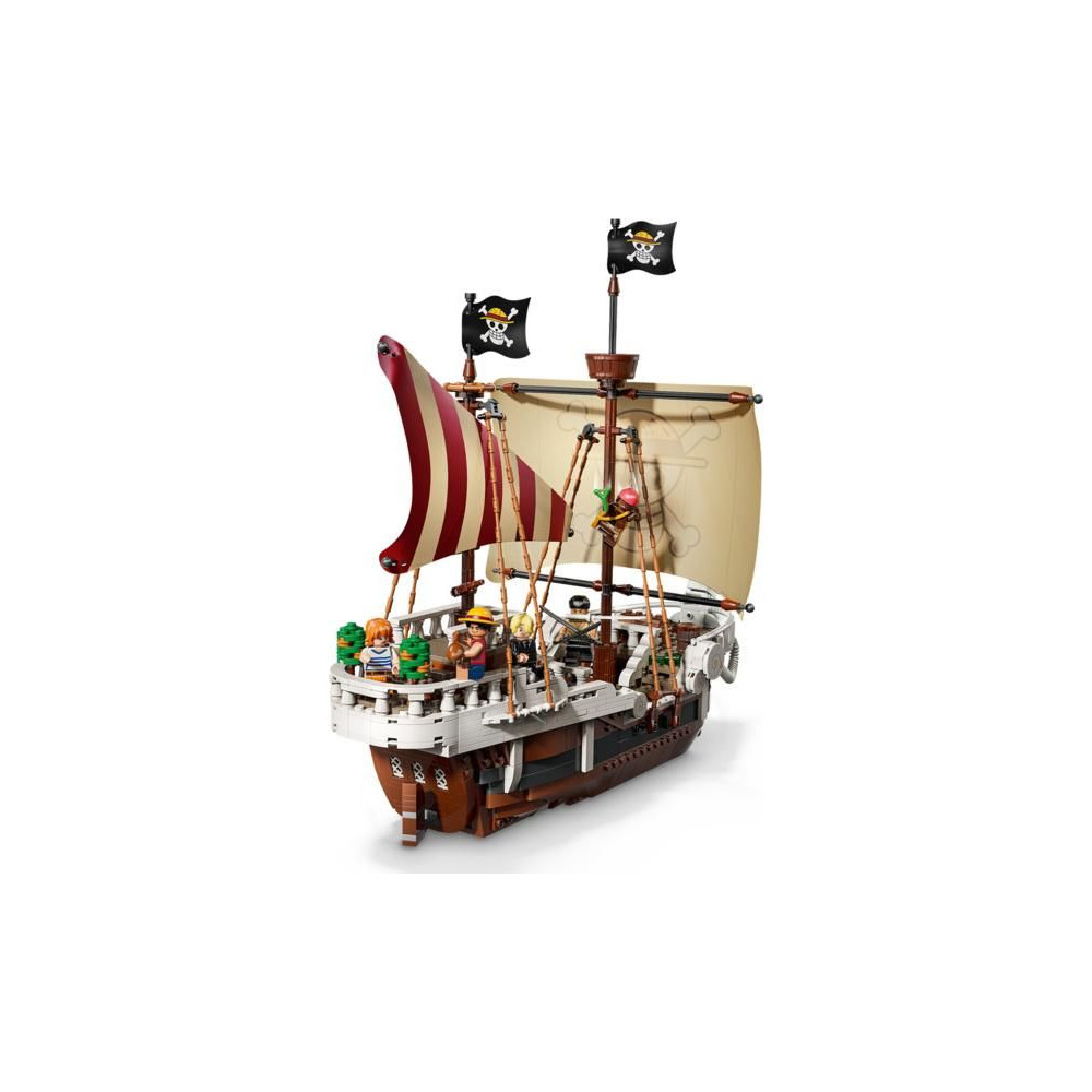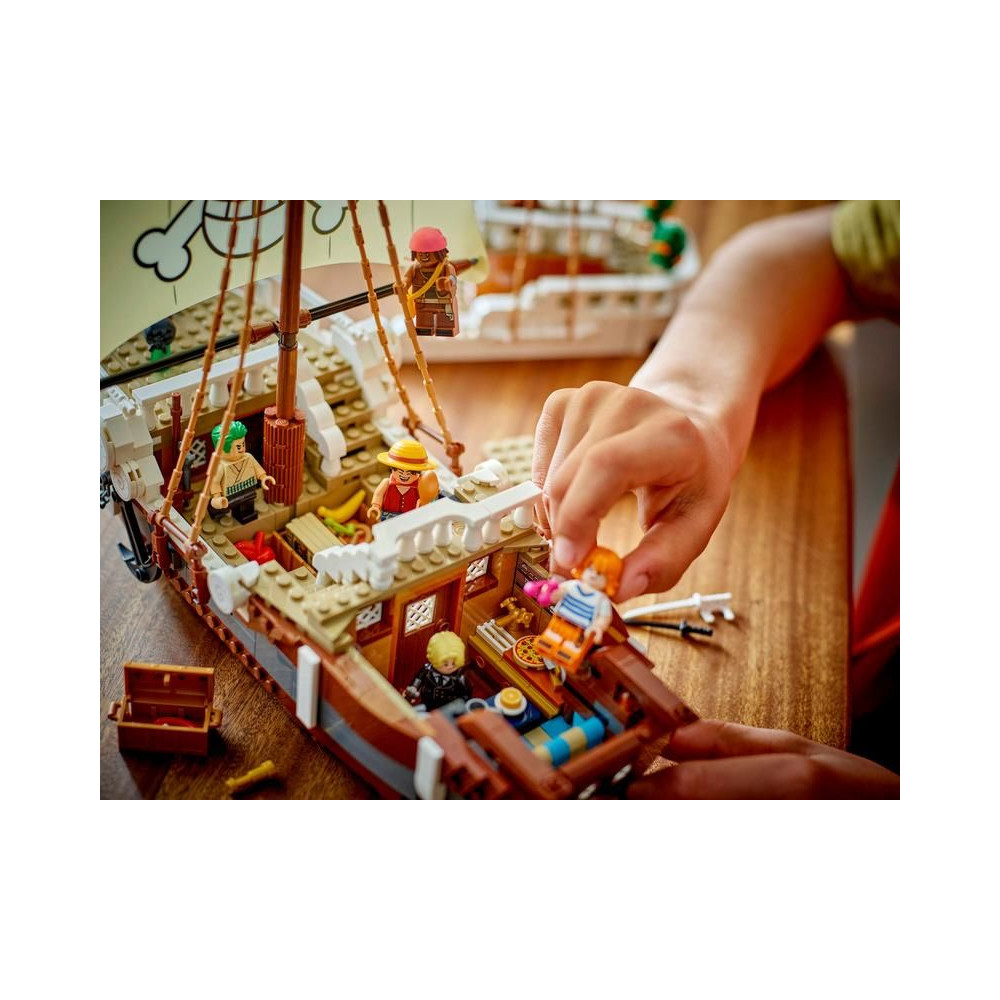 Ez az ikonikus hajó számos belső térrel rendelkezik: egy kabinnal a legénység számára, egy konyhával, egy raktárral és egy műhellyel a kiegészítőknek. A modell 5 LEGO ONE PIECE minifigurát tartalmaz. Luffy egy bárányfigurán ül a hajó orrán, alatta egy ágyúval, Zoro a fedélzeten pihen és edz, Nami irányítja a kormányt, miközben kedvenc mandarinjai a hátsó fedélzeten nőnek, Usopp felmászik az árbocokra és őrködik, Sanji pedig edényeket visz le a lépcsőn a konyhába. 4 poszter található körözött személyekkel. A LEGO Builder alkalmazás lehetővé teszi a gyerekek számára, hogy 3D-ben ráközelítsenek és elforgatsák a modelleket, és nyomon kövessék a haladást. A készlet 1376 alkatrészt tartalmaz.