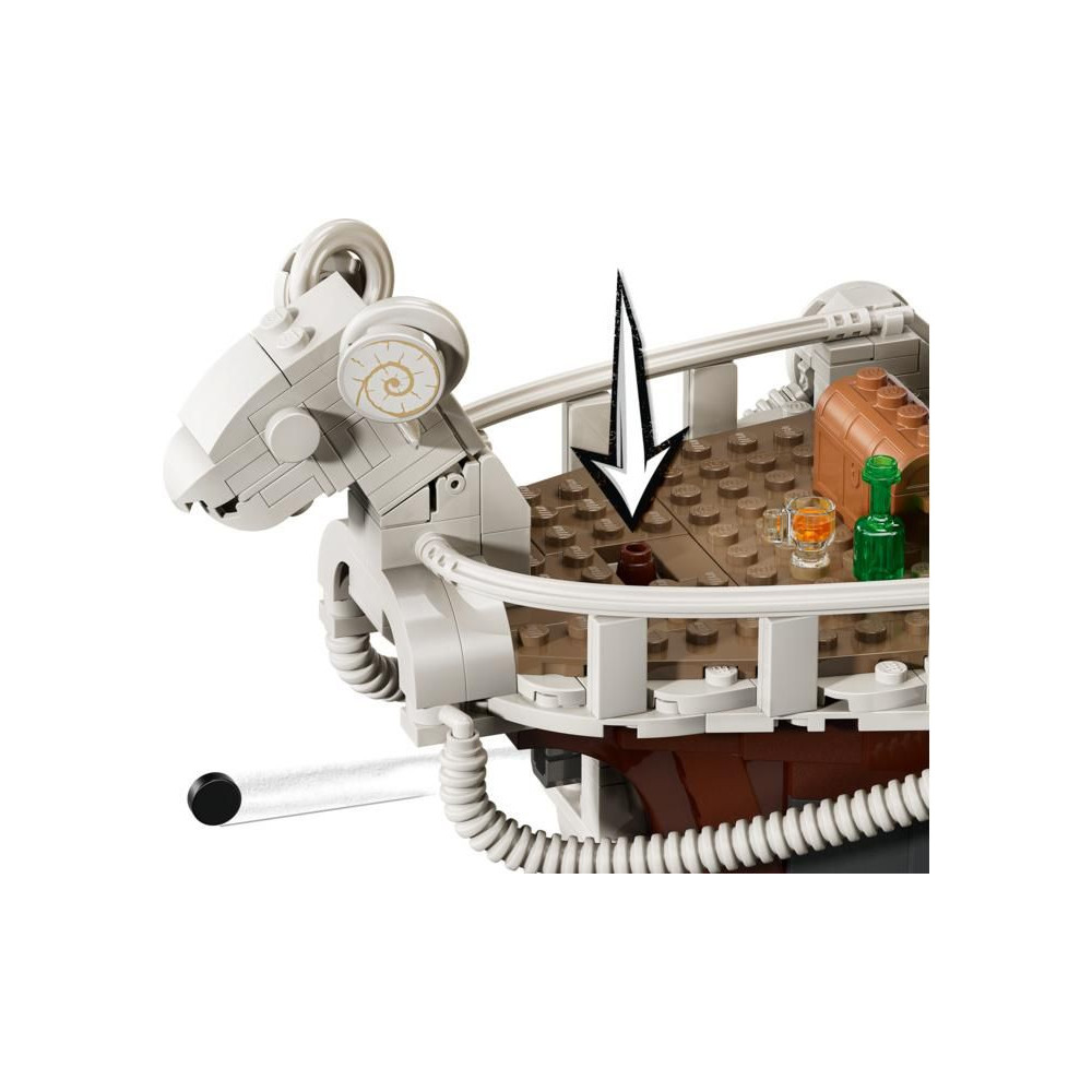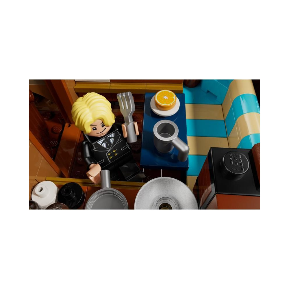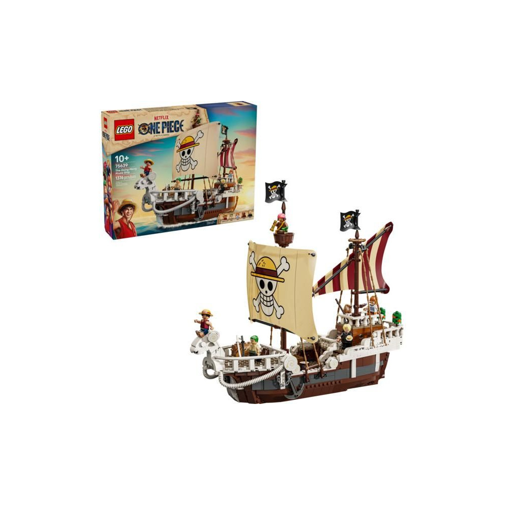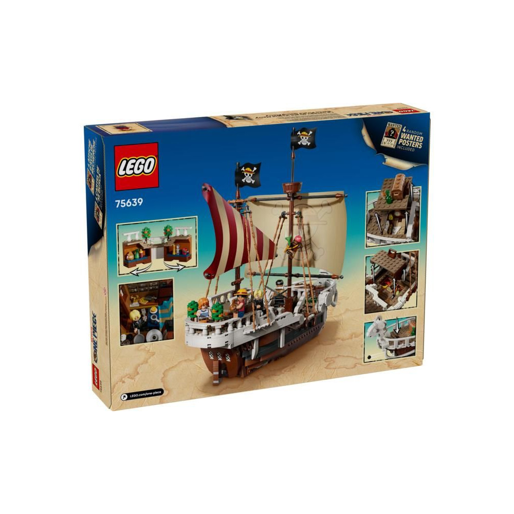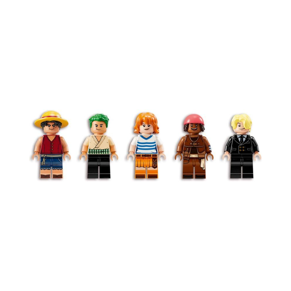 Ez az ikonikus hajó számos belső térrel rendelkezik: egy kabinnal a legénység számára, egy konyhával, egy raktárral és egy műhellyel a kiegészítőknek. A modell 5 LEGO ONE PIECE minifigurát tartalmaz. Luffy egy bárányfigurán ül a hajó orrán, alatta egy ágyúval, Zoro a fedélzeten pihen és edz, Nami irányítja a kormányt, miközben kedvenc mandarinjai a hátsó fedélzeten nőnek, Usopp felmászik az árbocokra és őrködik, Sanji pedig edényeket visz le a lépcsőn a konyhába. 4 poszter található körözött személyekkel. A LEGO Builder alkalmazás lehetővé teszi a gyerekek számára, hogy 3D-ben ráközelítsenek és elforgatsák a modelleket, és nyomon kövessék a haladást. A készlet 1376 alkatrészt tartalmaz.