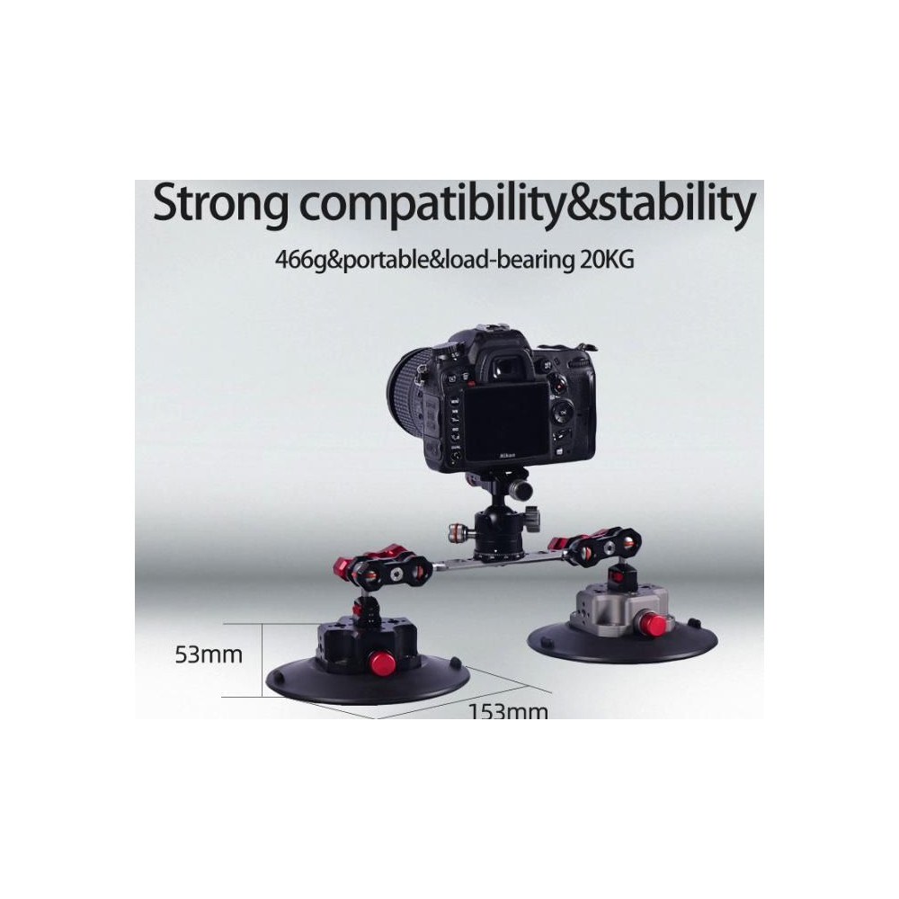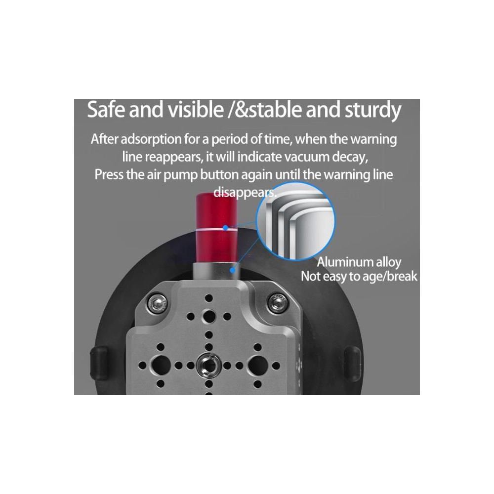 The button is also made of aluminum alloy. With 1/4inch, 3/8inch, Alai Positioning Holes, and 3/8inch to 1/4inch screw. Suitable for DSLR, action cameras, or smartphones. Max. Payload: 2000g. Cup Size: 153 x 50mm. 466g