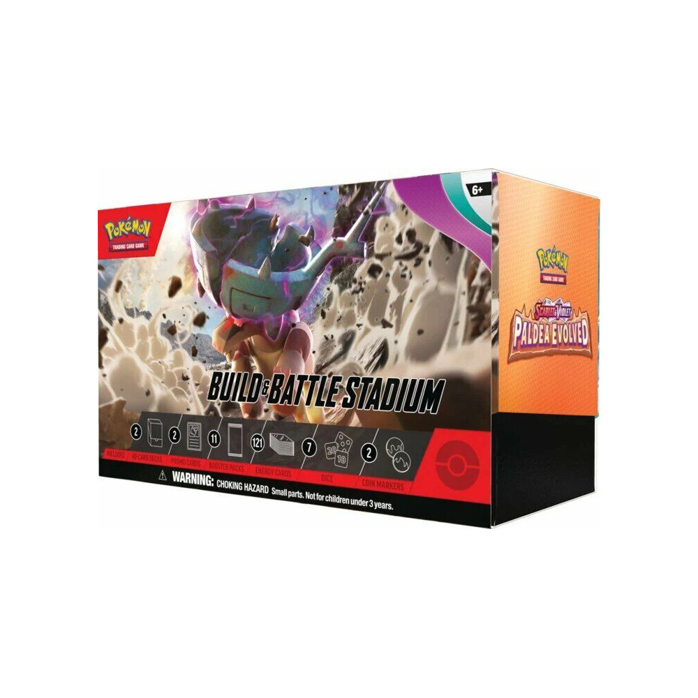 V tejto krabičke sa schováva všetko čo potrebujú dvaja hráči na stavbu balíčka a odohranie kartového duelu. Každý Paldea Evolved Build & Battle Stadium set obsahuje 3 Paldea Evolved boostre (balíčky), 121 kariet energií, 6 kociek na počítanie zranení, 1 vyhodnocovaciu mincu, 2 žetóny kondícií, odkladaciu krabičku, ale hlavne dva Build & Battle boxy, z ktorých každý obsahuje ďalšie 4 booster packy a 40-kartový balíček s exkluzívnou foil kartou (1 zo 4 variant). Tieto balíčky sú pripravené na hru, ale hráči si ich môžu vylepšovať kartami z boostrov (balíčkov) a trénovať sa tak v stavaní a vylepšovaní hracích balíkov. Produkt odporúčame hlavne pre hráčov, ktorí by si radi vyskúšali budovanie vlastných balíčkov.