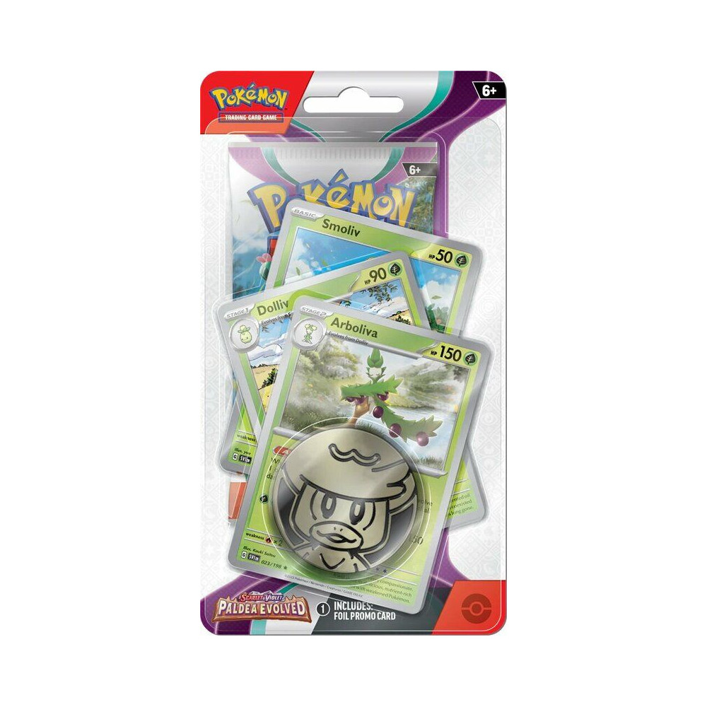 V balení nájdete jeden booster (balíček) zo série Paldea Evolved, promo kartu evolučnej línie Pokémonov Smoliv, Dolliv, Arboliva a hádzaciu mincu.