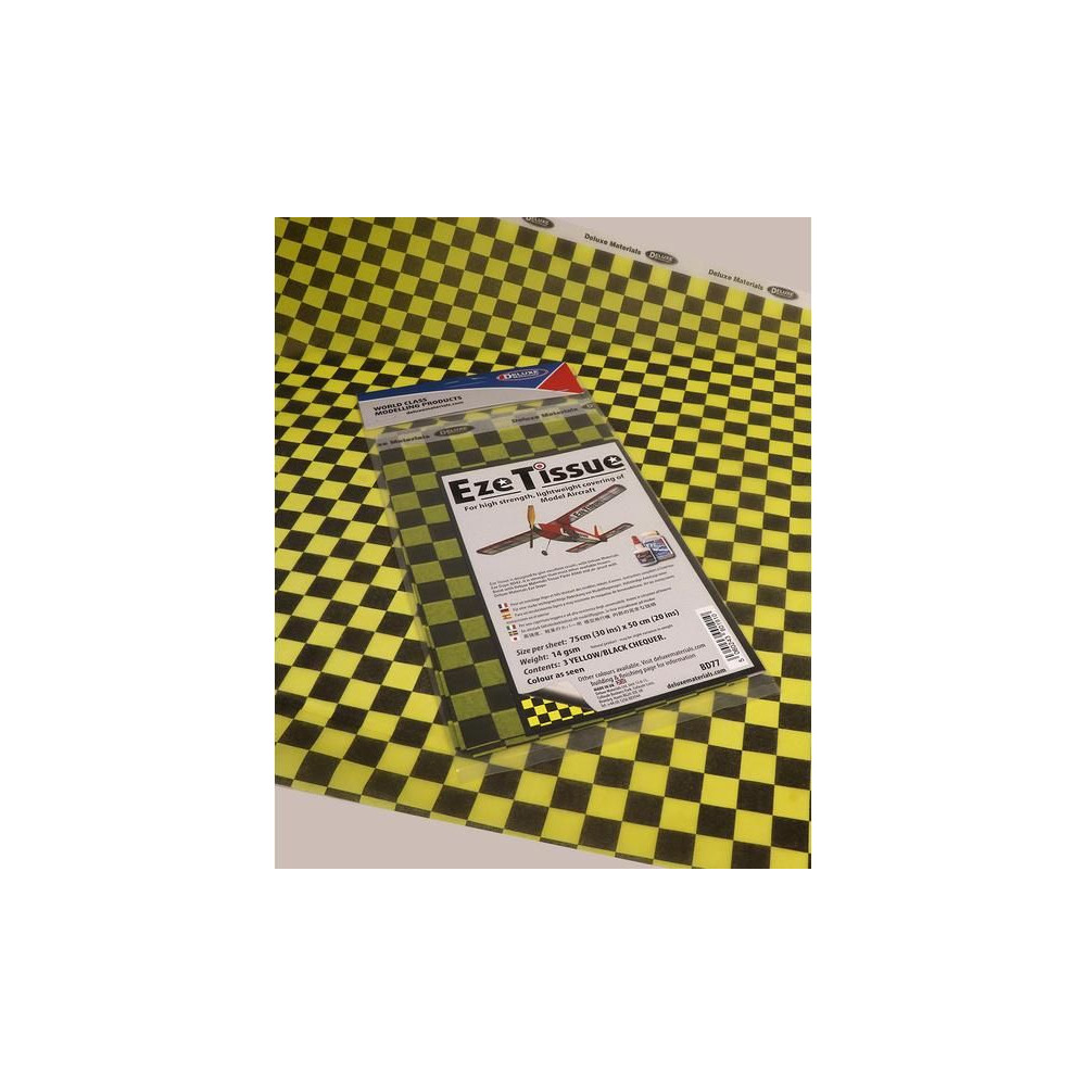 Eze Tissue bevonópapír 14 g/m², méret 75x50 cm, sárga-fekete kockás (3 lap csomagonként). A bevonópapír alkalmas szabad modellekhez, retro vintage és iskolai vitorlázórepülőkhöz, gyűrűkhöz stb.