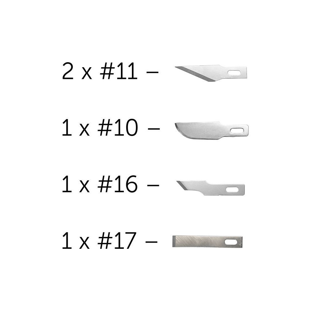 Modelcraft tartalék pengék (2x#11, #10, #16, #17). 2 x #11 Classic penge a finom vágáshoz. 1 x #10 Univerzális ívelt penge a trimmeléshez. 1 x #16 Penge a részletes vágásokhoz szakadás nélkül. 1 x #17 Vágó penge a vékony rétegek eltávolításához. Válogatott pengék minden aprólékos és precíziós munkához.