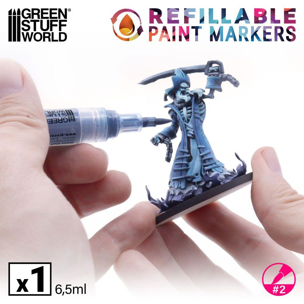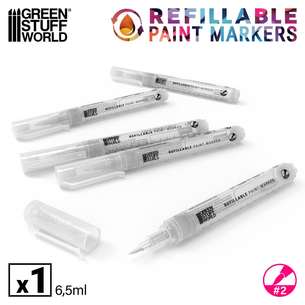 Green Stuff World utántölthető marker, 2.0-ás méret (1 db). Ideális alapozókhoz, bázisfestékekhez, wash-okhoz, tintákhoz és lakkokhoz. Újratölthető, egyenletes festékfolyást biztosít.