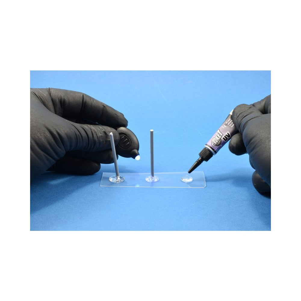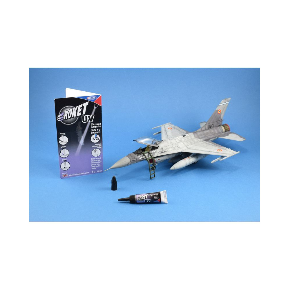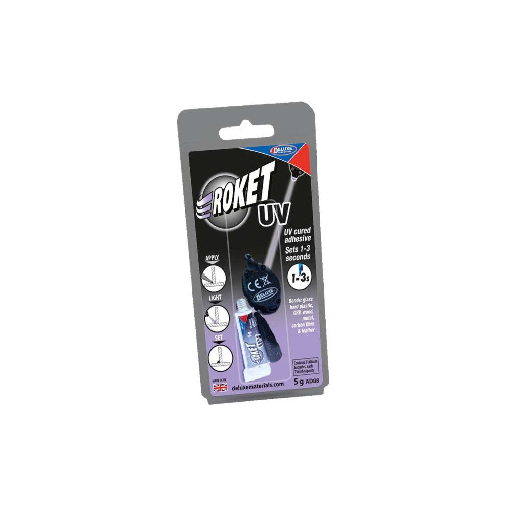 A Deluxe Materials Roket UV ragasztója az egyik olyan ragasztó, amely UV-sugárzással gyógyul. A Roket UV teljesen tiszta ragasztást eredményez, kemény műanyagokat, kompozit anyagokat, fát és fémeket ragaszt.