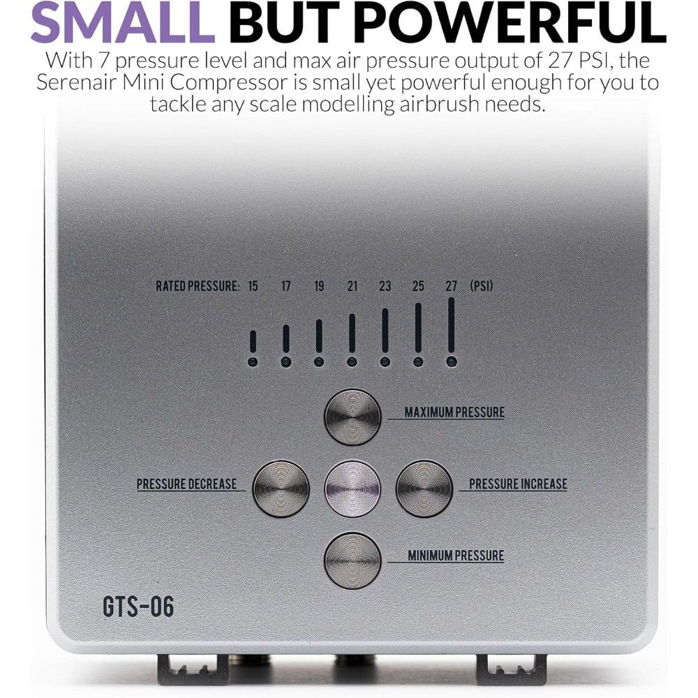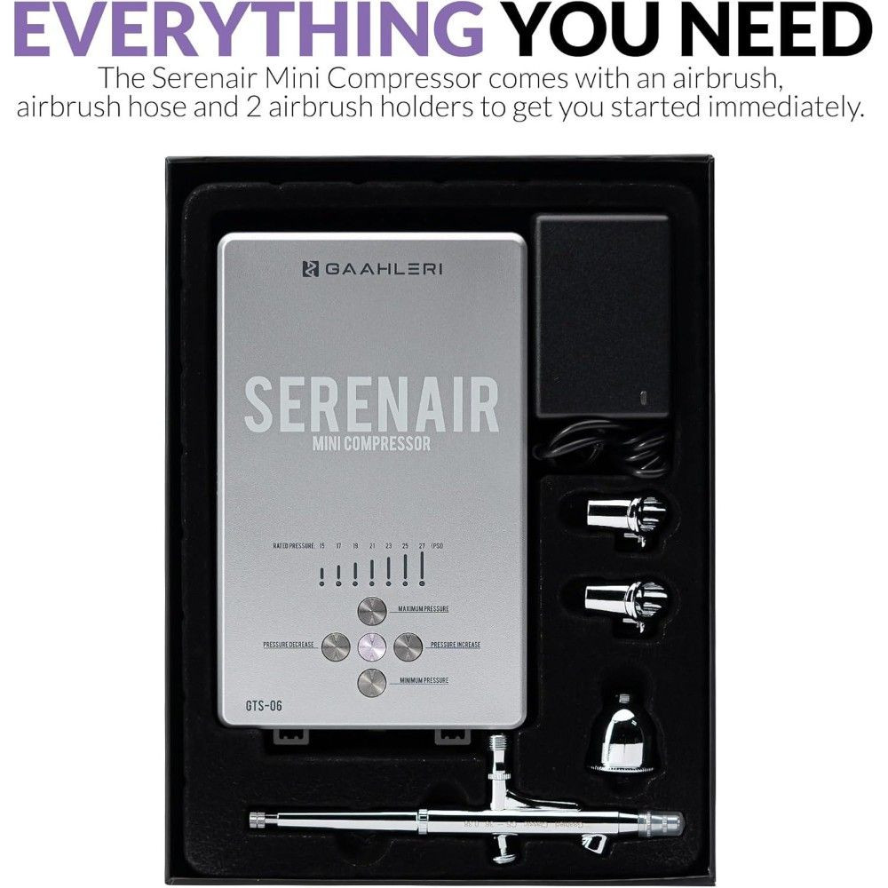 A Gaahleri Ambition Series GTS-06 Serenair egy komplett airbrush készlet, amelyet hobbi festők és haladó miniatűr festők számára terveztek. A kompakt, mégis nagy teljesítményű mini kompresszor stabil és egyenletes levegőellátást biztosít, lehetővé téve a precíz és következetes eredmények elérését minden projekten.