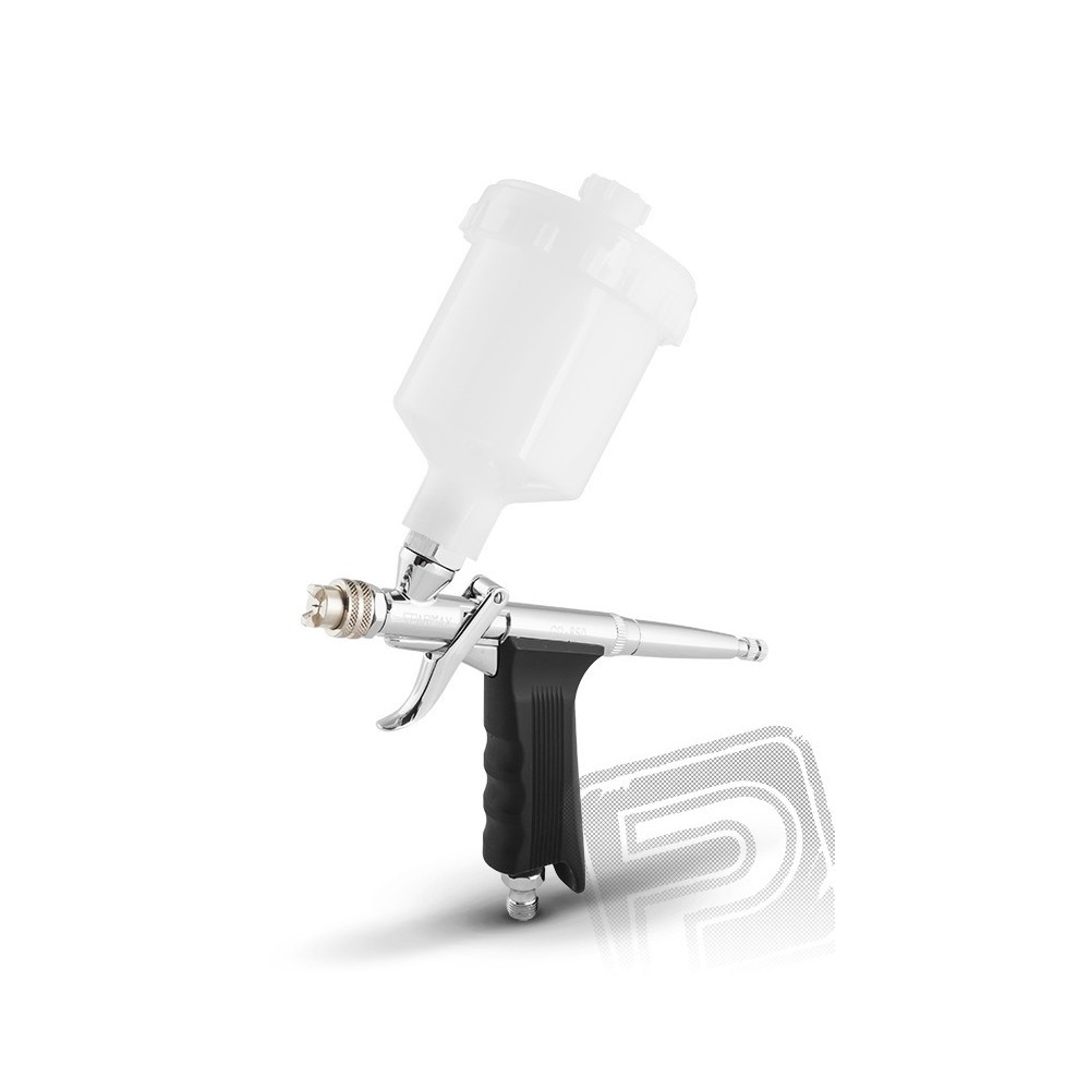 Airbrush pisztoly anatómiai alakú fogantyúval alkalmas a nagyobb felületekre, felülről töltendő nagytömegű palackkal. Ideális az RC karosszériák maszkolási emulziók permetezéséhez, és a normál háztartási hobby tevékenységhez. A minta típusa egyszerűen megváltoztatható a fúvóka sapka csere által.