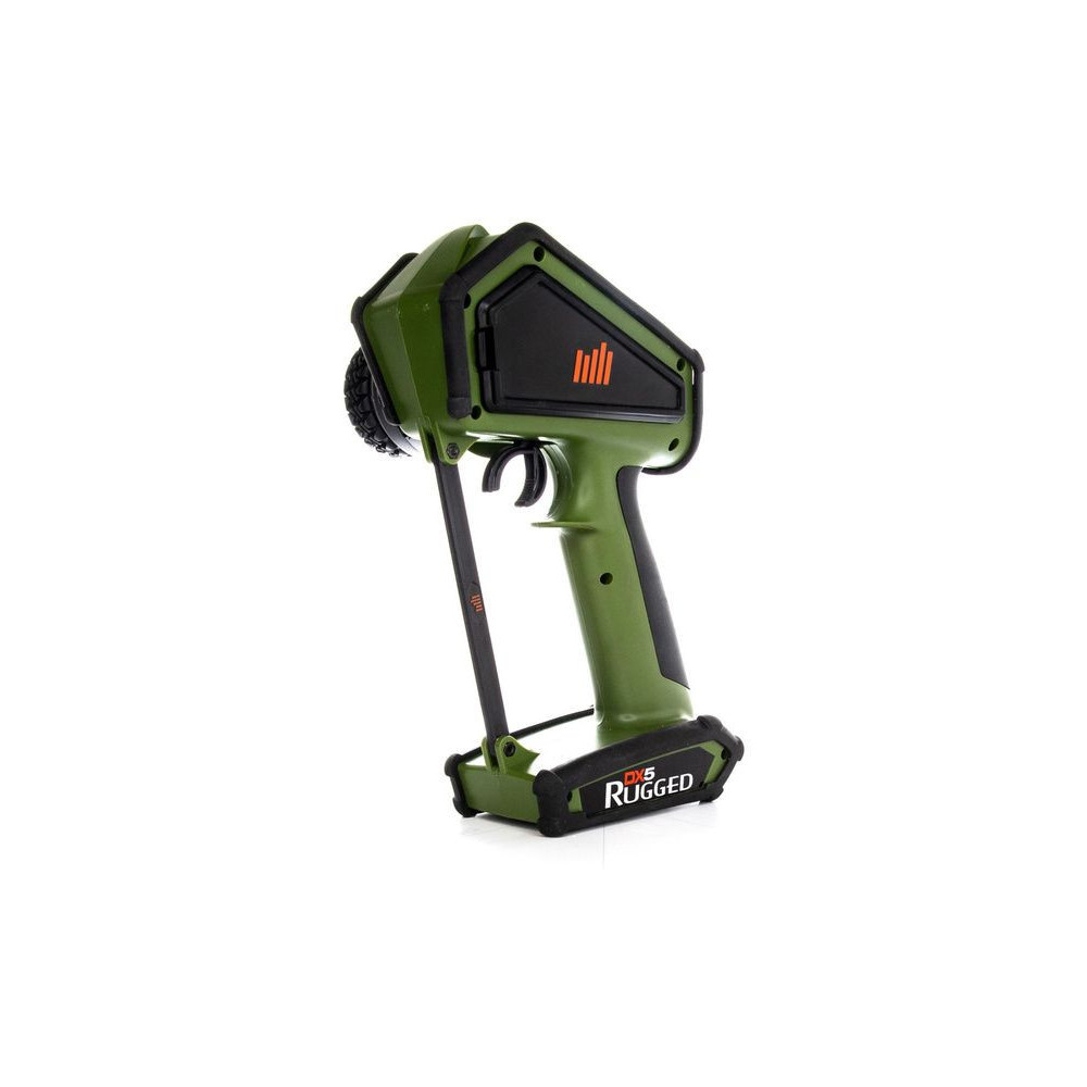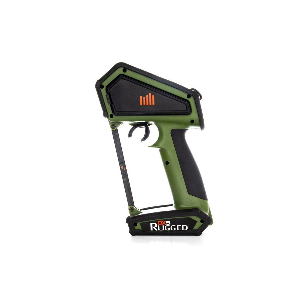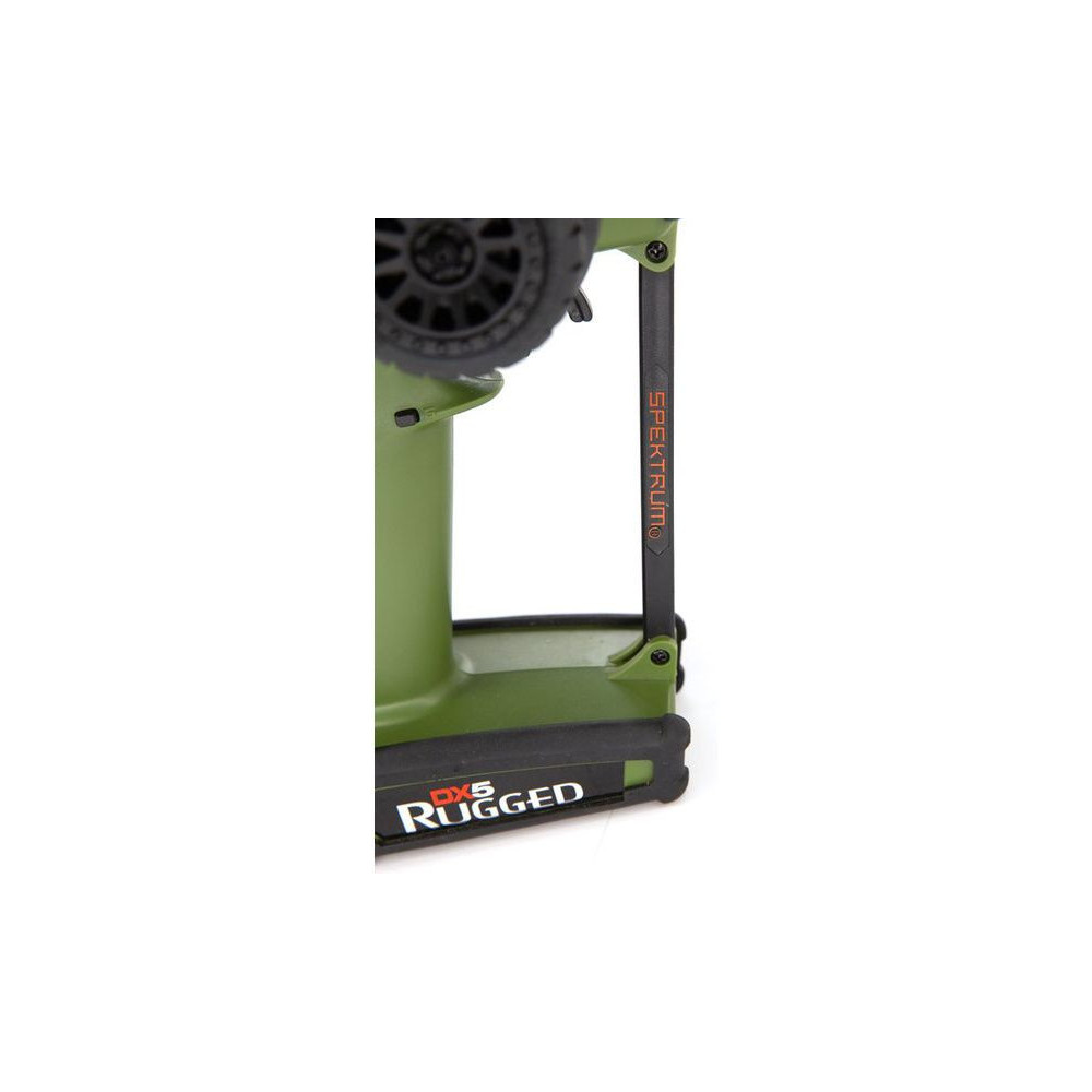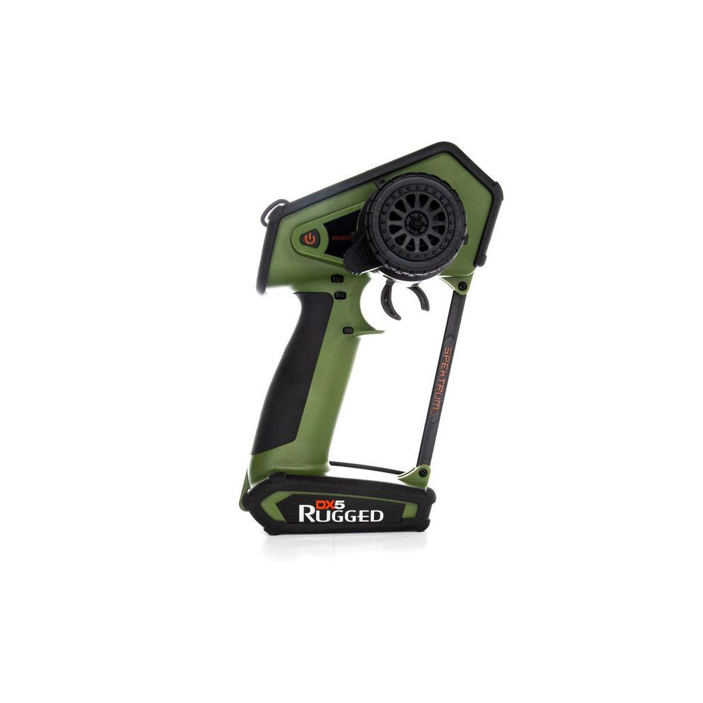 Van off-road RC modellje, és szüksége van egy stílusos megjelenésű jeladóra hozzá? A Spektrum DX5 Rugged egy ütésálló adóházzal rendelkezik, amely körös-körül puha tapintású díszlécekkel, belső antennával, karabiner gyűrűvel, masszív kormánykerékkel és hüvelykujjas kormánykarral rendelkezik.