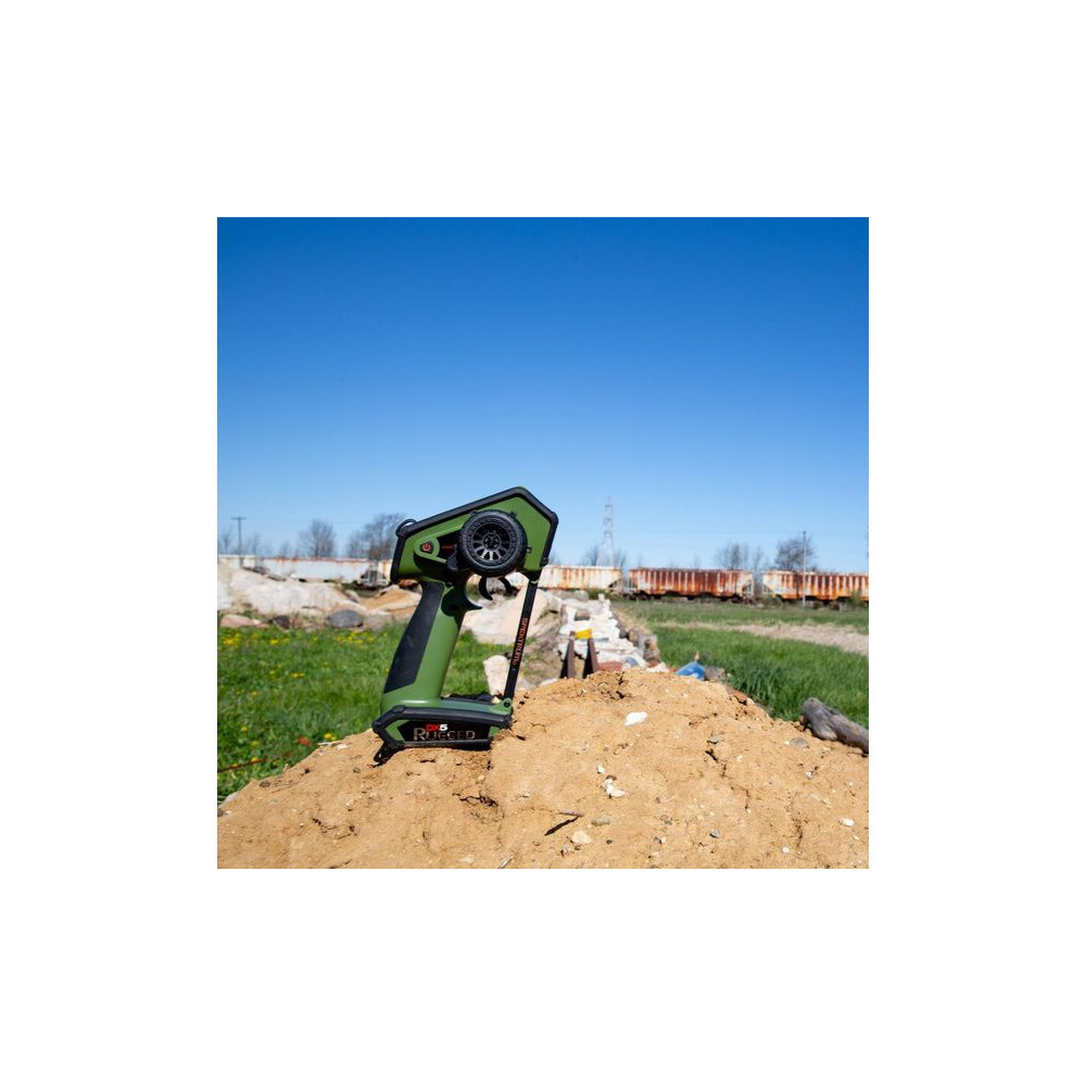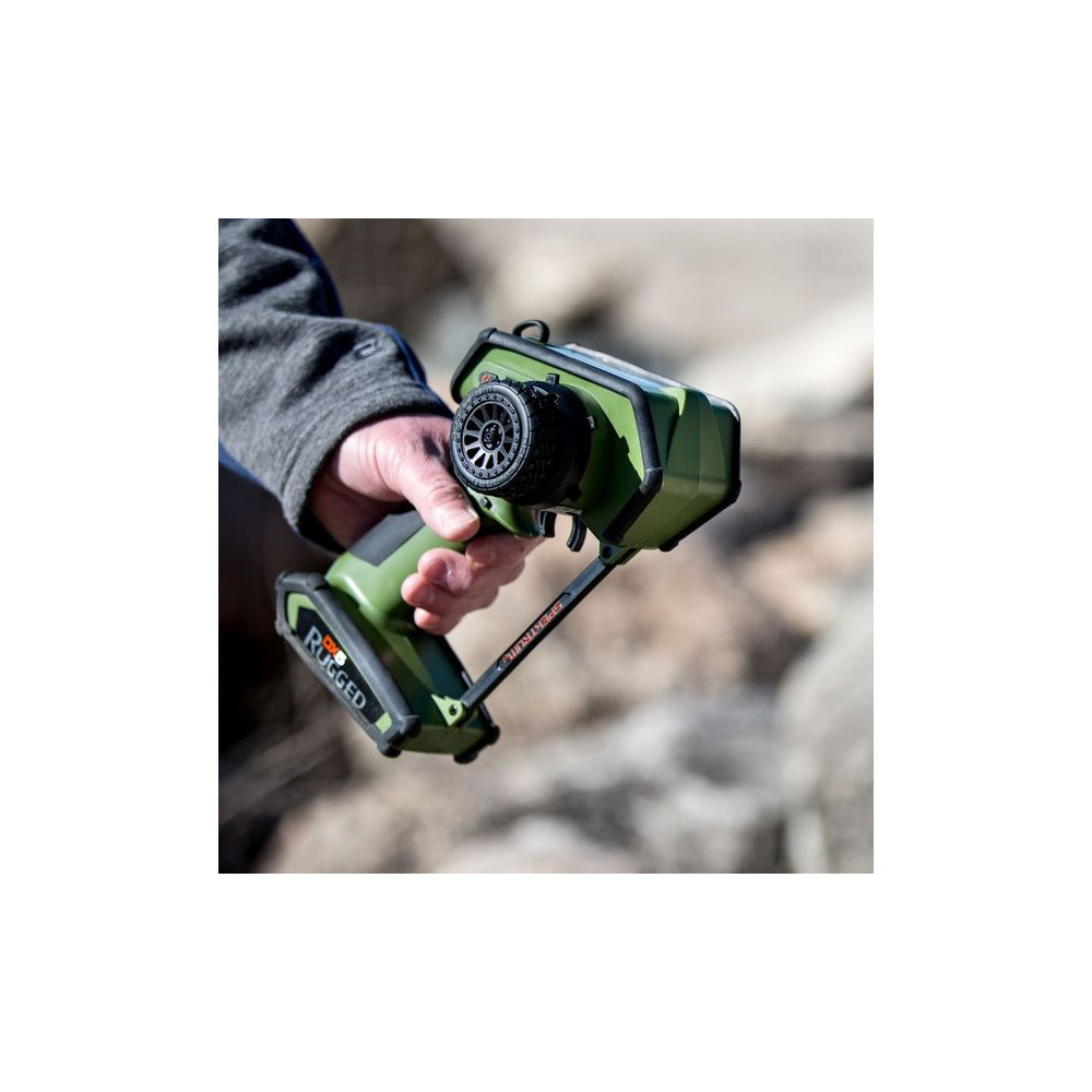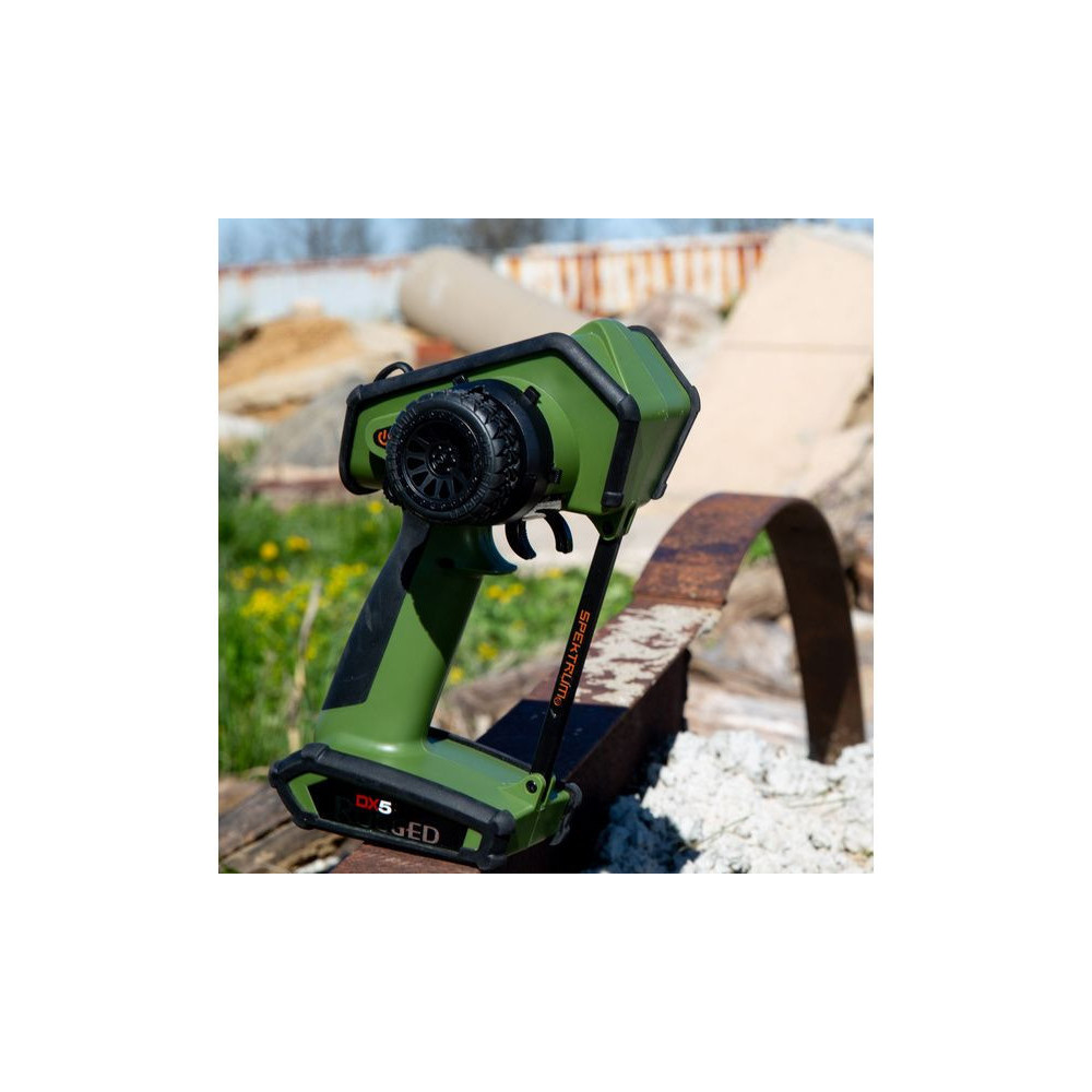 Megvan a terepjáró RC modellje, és szüksége van egy stílusos és jól programozott jeladóra? A Spectrum DX5 Rugged DSMR kétségtelenül a tökéletes adó. Szekrényét körös-körül puhított lapátok védik a rozsdától, az adó rendelkezik belső antennával, karabinerre rögzíthető gyűrűvel, stabil kormánykerékkel és nagyméretű hüvelykujjkeréktartóval a hüvelykujjas kormányzáshoz. Természetesen a szoftver intuitív.