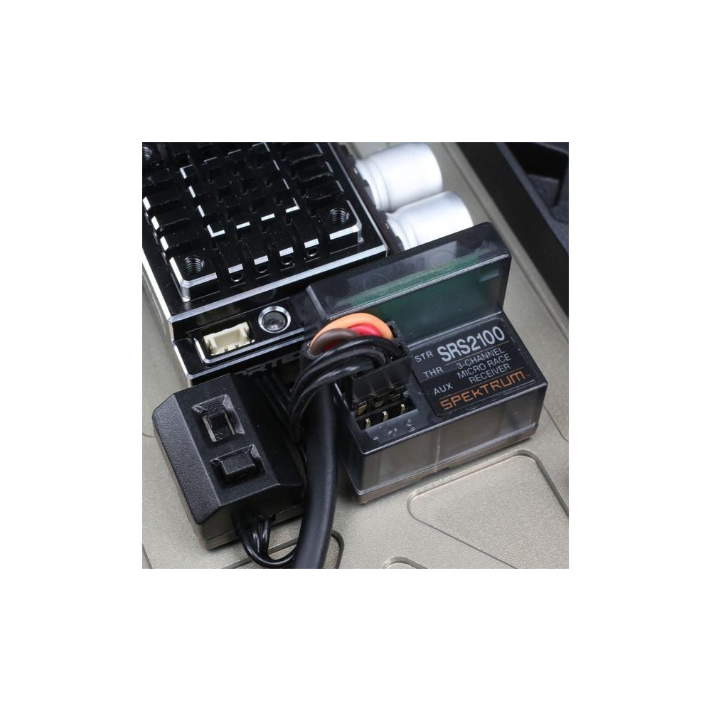 A Spektrum SR2100 DSMR® racing 3 csatornás mikrovevőkészülék integrált antennával, 5,5 ms gyors válaszidővel, Reliakote nedvesség elleni bevonattal és Bind gombbal rendelkezik az egyszerű párosításhoz.