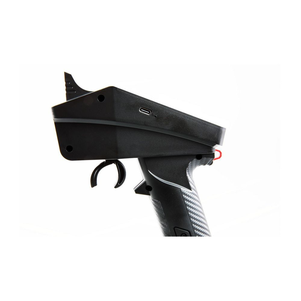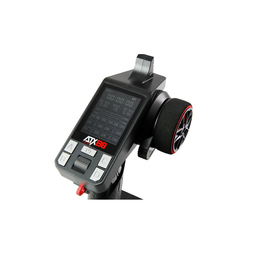 A 8 csatornás ATXB8 fegyver távirányító számos funkciót kínál és könnyen kezelhető. Minden csatorna programozható, akár 8 modell tárolására is van memória, és egy nagyméretű színes kijelző biztosítja a tiszta áttekintést. Ezenkívül a távirányító keverési funkciókkal rendelkezik a különböző csatornákhoz, lehetővé téve a rugalmas vezérlést. Az integrált telemetriai funkció valós időben mutatja a modell akkumulátorának feszültségét vagy a vevő teljesítményét közvetlenül a kijelzőn. További praktikus funkciók közé tartozik a gáz- és kormánysebesség-beállítás, valamint a szervo irányának egyedi beállításának lehetősége minden csatornán. A kényelmes egykezes kezelés érdekében egy kiegészítő kart építettek be a kormánykerékbe. A rendszer könnyen frissíthető USB-C csatlakozón keresztül, vagy például szimulátorokhoz is használható. A távirányítót a gázkarral, a kormányon, a kormánykapcsolóval (SWB), a kormány feletti háromállású kapcsolóval (SWA) és a tetején található négy gombbal lehet működtetni. A digitális trimm minden beállítást véglegesen elment, még akkor is, ha a távirányítót ki- és bekapcsolja. További biztonsági funkció az automatikus kikapcsolás, amely 15 perc inaktivitás után aktiválódik. A jeladó egy perccel a kikapcsolás előtt sípoló hangot ad az elem élettartamának megőrzése érdekében. További funkcióként egy integrált autóverseny játék is elérhető, amelyet a távirányító kormánykerekével és gázkarjával lehet irányítani, a kijelző pedig a játék képernyőjeként szolgál.