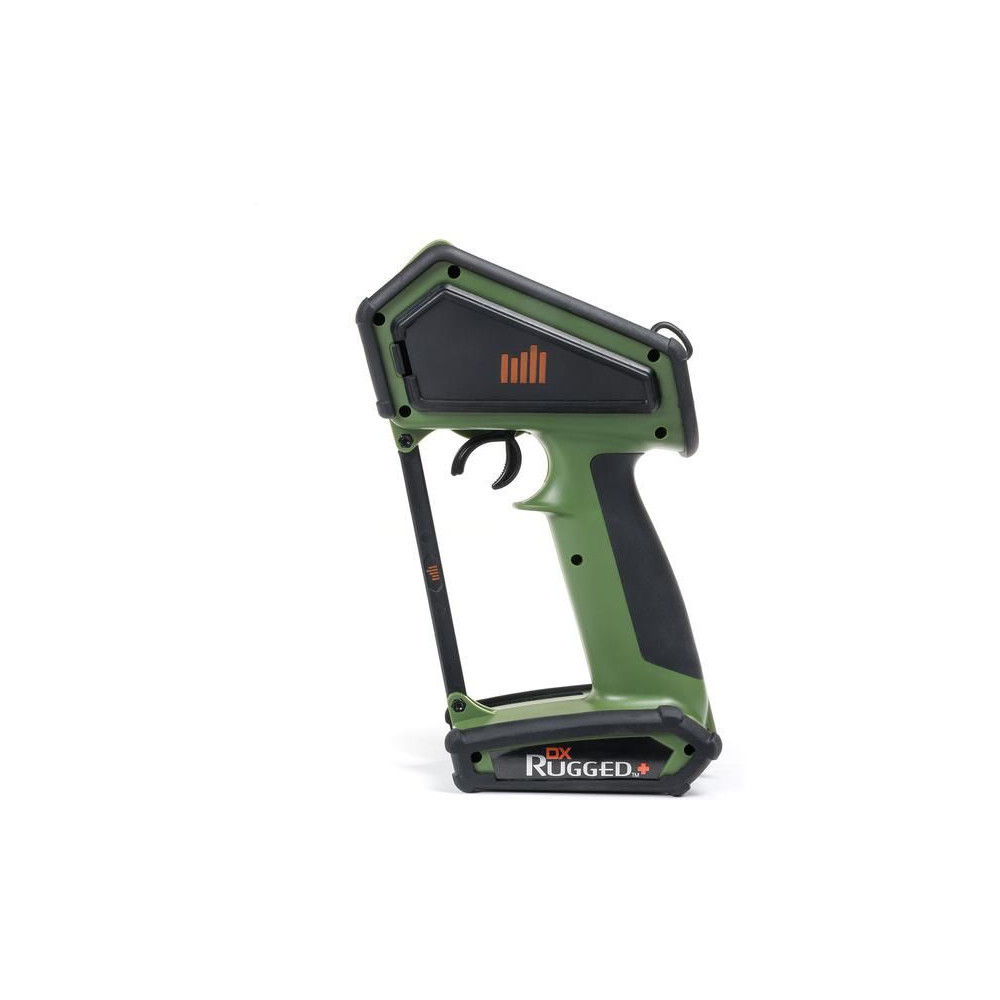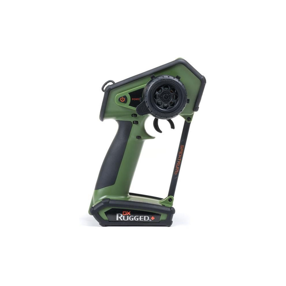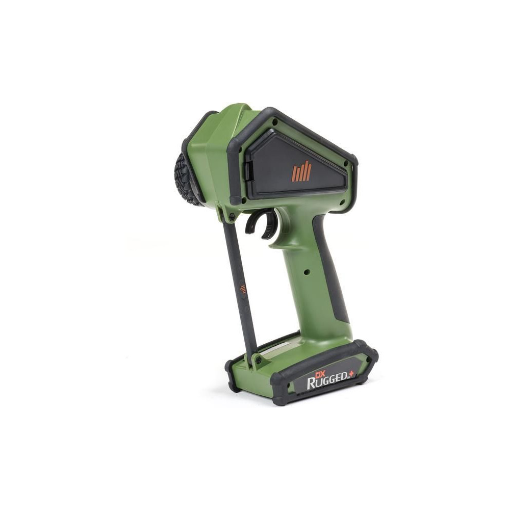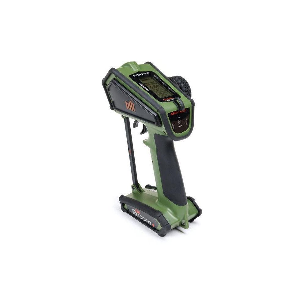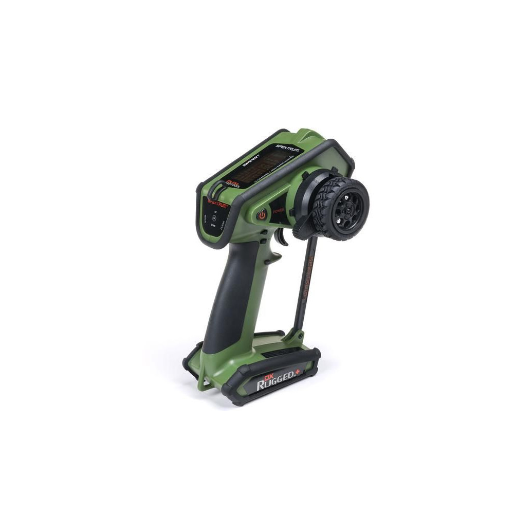 Kormánykerék, mechanikailag ellenálló , 12 csatornás Spektrum DX Rugged+ zöld adóvevő kettős protokollal (DSMR+ és SLT), valamint Spektrum Smart technológia támogatással. 20 modell memóriája, nagyméretű LCD kijelző, intuitív vezérlés, széleskörű beállítási lehetőségek.