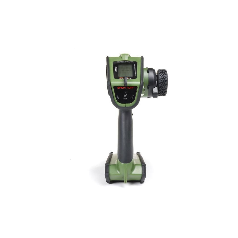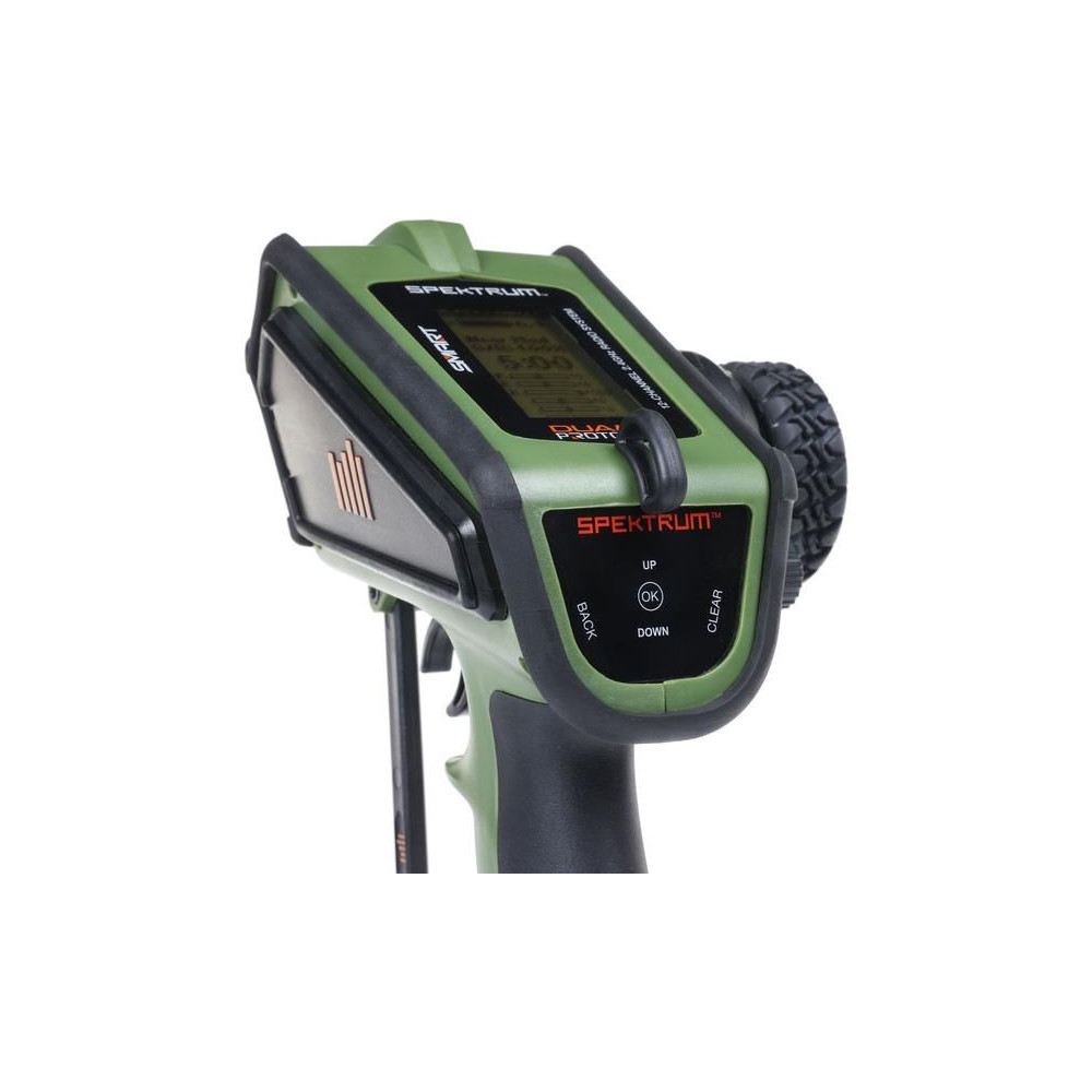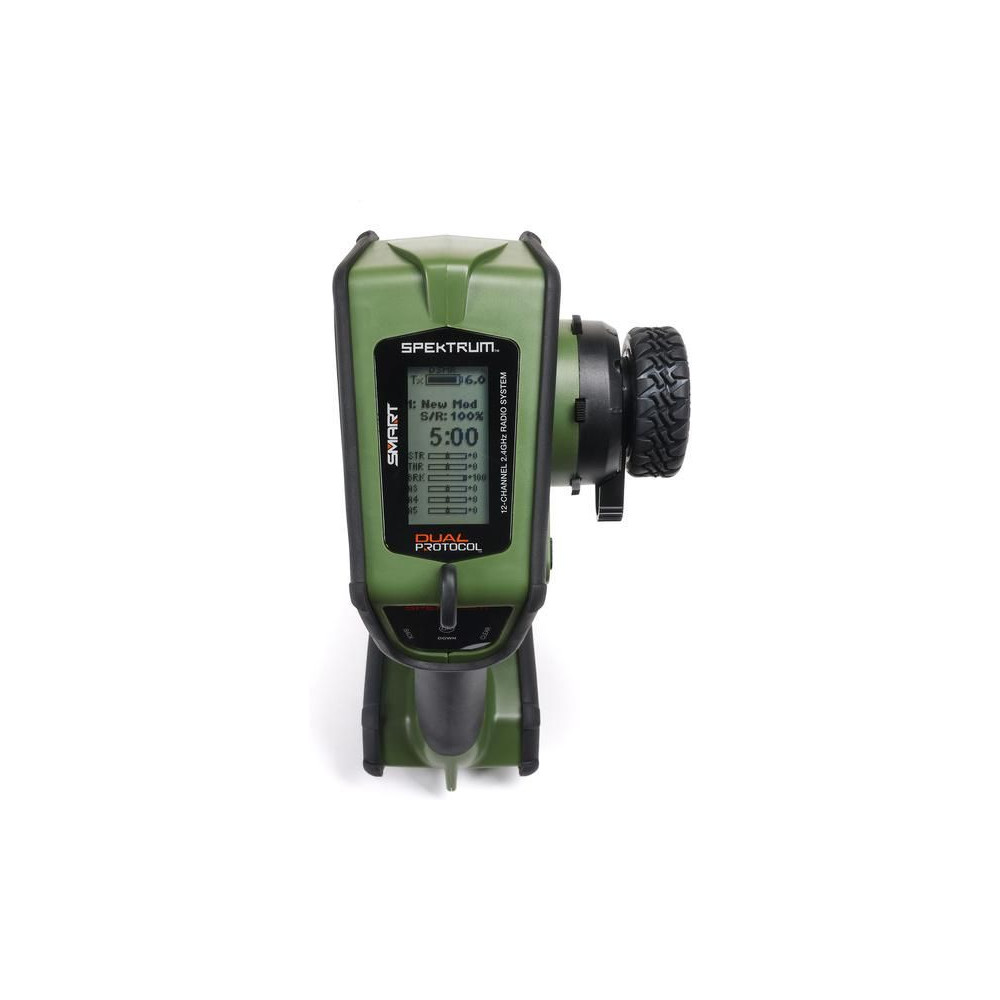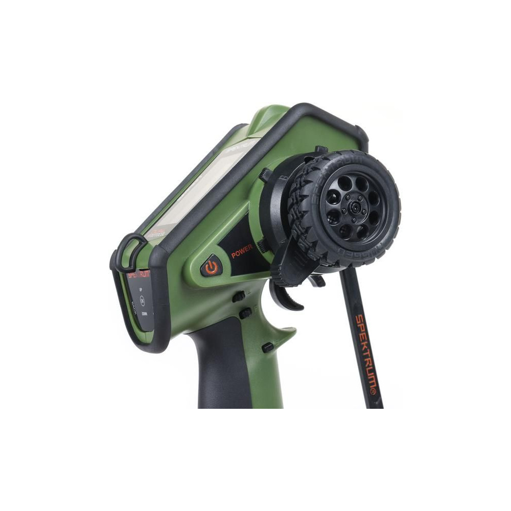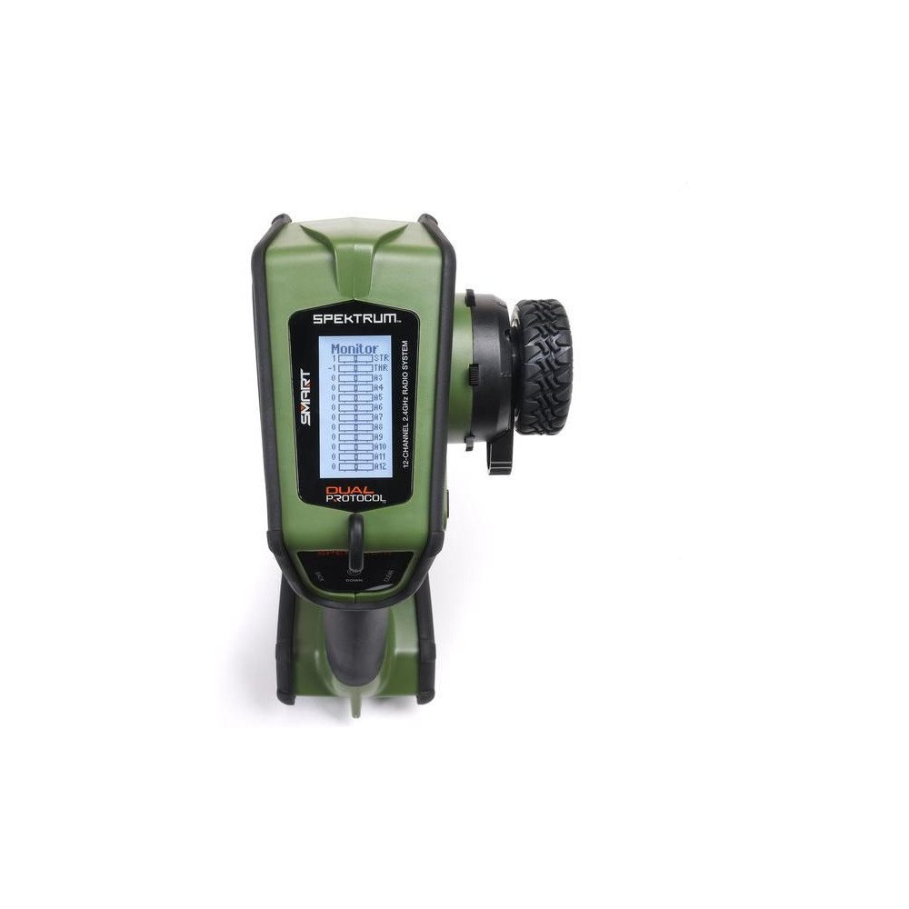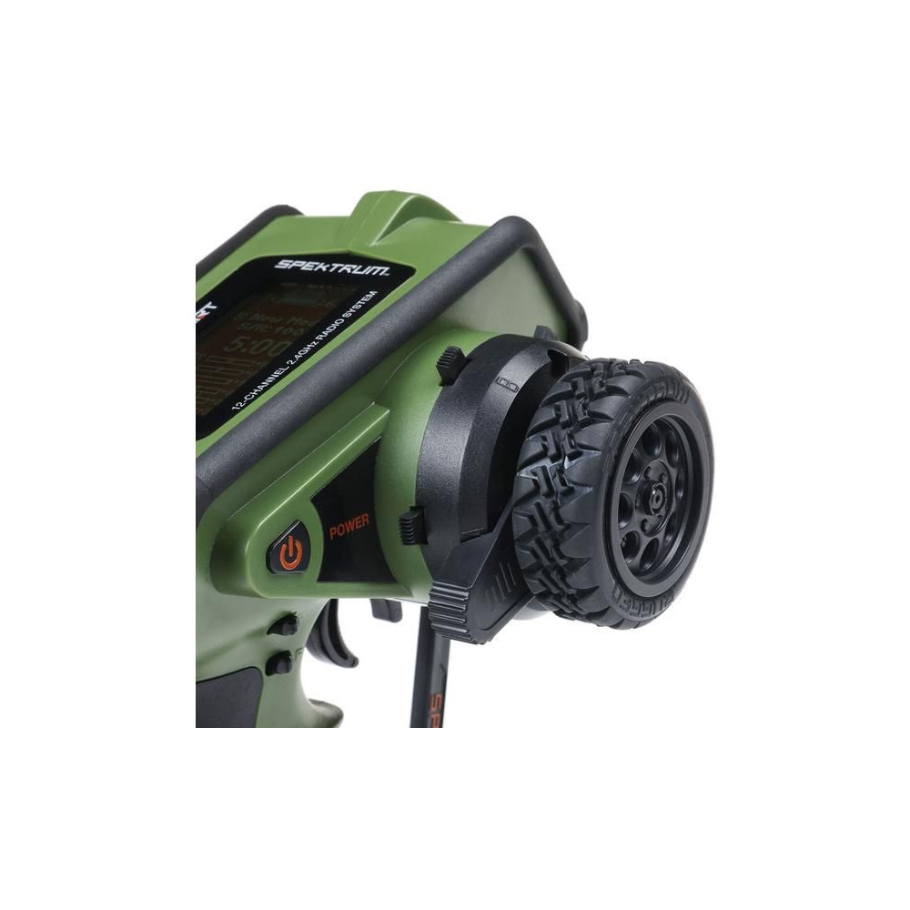 Kormánykerék, mechanikailag ellenálló , 12 csatornás Spektrum DX Rugged+ zöld adóvevő kettős protokollal (DSMR+ és SLT), valamint Spektrum Smart technológia támogatással. 20 modell memóriája, nagyméretű LCD kijelző, intuitív vezérlés, széleskörű beállítási lehetőségek.