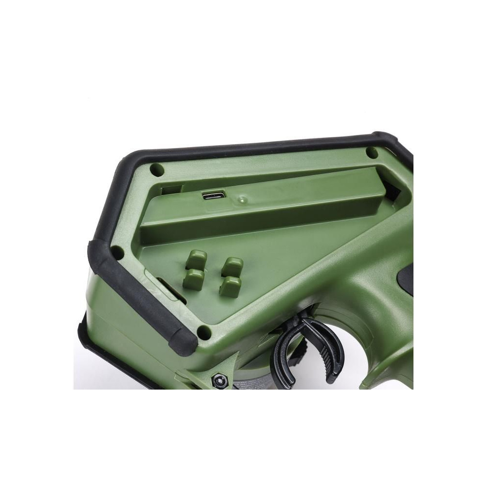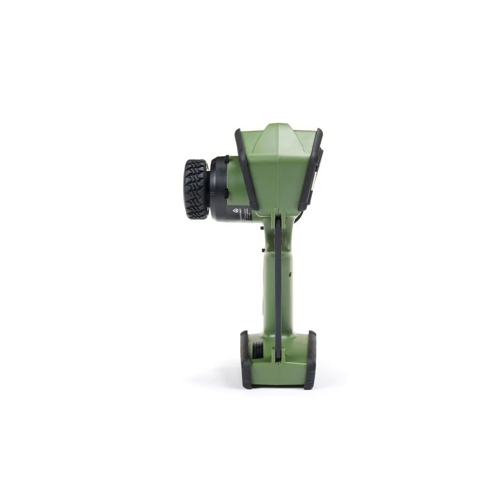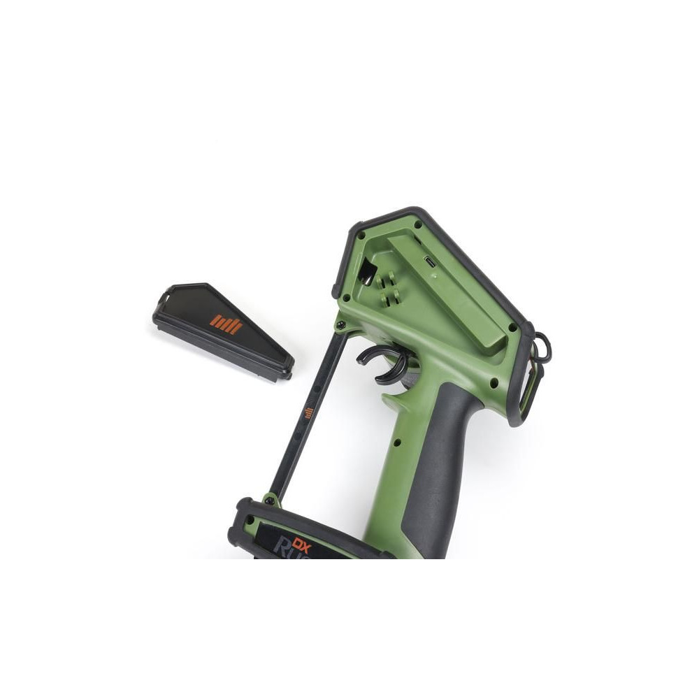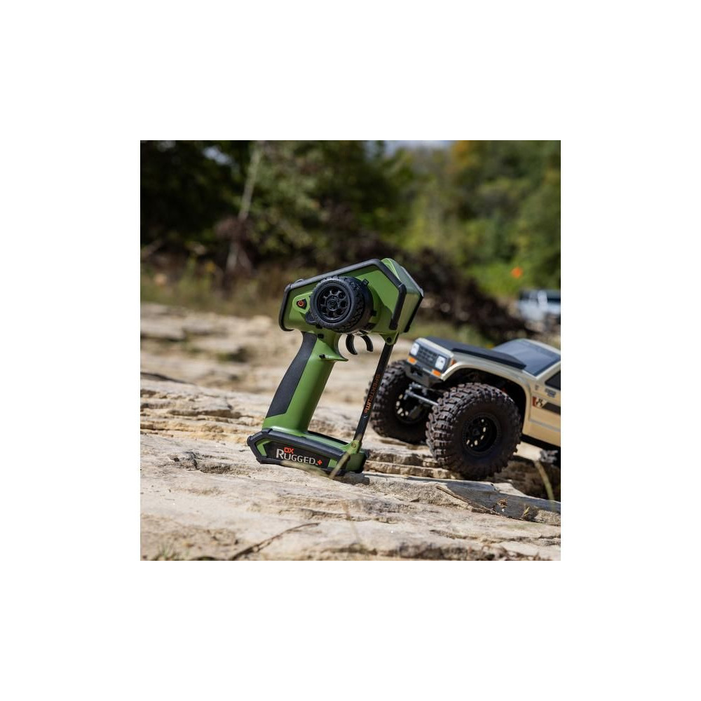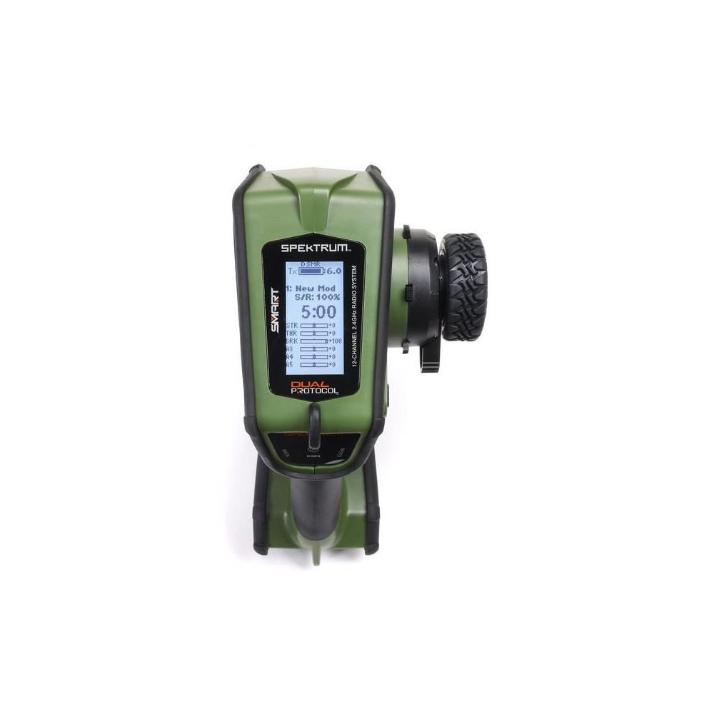 Kormánykerék, mechanikailag ellenálló , 12 csatornás Spektrum DX Rugged+ zöld adóvevő kettős protokollal (DSMR+ és SLT), valamint Spektrum Smart technológia támogatással. 20 modell memóriája, nagyméretű LCD kijelző, intuitív vezérlés, széleskörű beállítási lehetőségek.