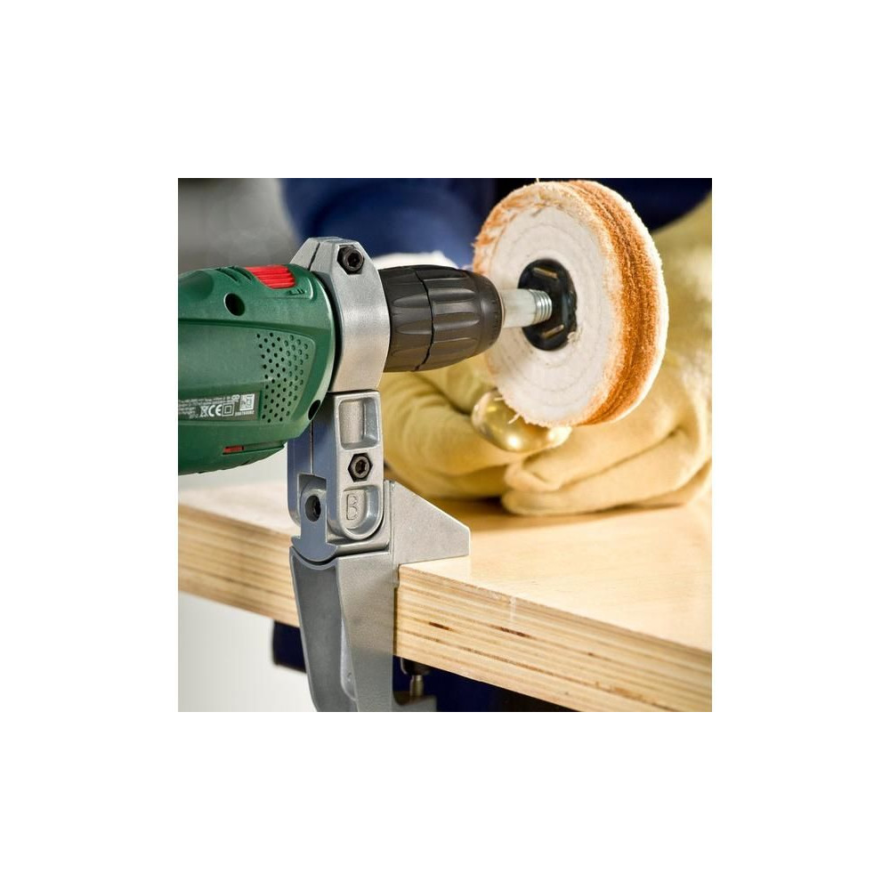 Az univerzális fúróbilincs fő alkotóelemei öntött alumíniumból készülnek, a kiegészítő részek pedig bevonatos acélból. Gyakorlatilag bármilyen 43 mm-es (euro) gallérral rendelkező fúrógépet rögzít asztalhoz vagy munkapadhoz. Húzza meg a hengerfejcsavarokat a fúrógép szilárd rögzítéséhez. A mozgástartomány lehetővé teszi az optimális pozíció kiválasztását egy adott tartozékhoz vagy feladathoz. Rendkívül hasznos rugalmas tengelyek, drótkefék, polírozó mopok, csiszolókorongok vagy más fúrógépre szerelt tartozékok használatakor. A fúrószár rögzítésével mindkét keze szabadon tarthatja a munkadarabot.
