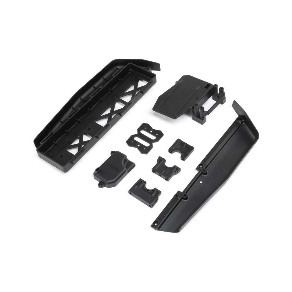 Pótalkatrész RC modellautóhoz Team Losi Racing: 8XE 2.0 - akkumulátor ágy, központi differenciálmű tartó, szervó ágy.