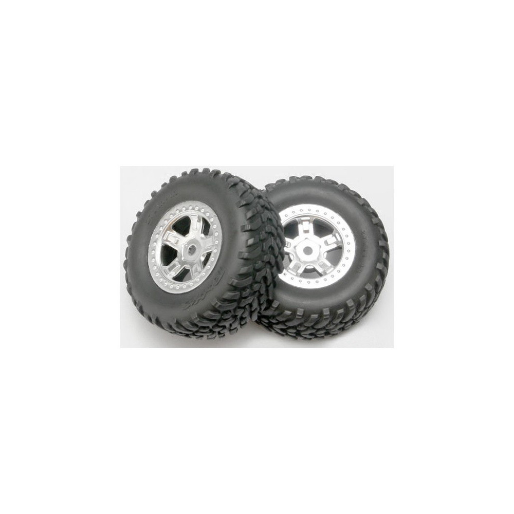 Komplett univerzális kerekek Traxxas Slash 1:16 RC autókhoz. Ezüst tárcsa felragasztott Off-Road gumikkal és betéttel. Tárcsa mérete 38/50x27 mm. Teljes méret 66x29 mm. A hordozó 12 mm-es hatszögletű, 24 mm-es eltolással.