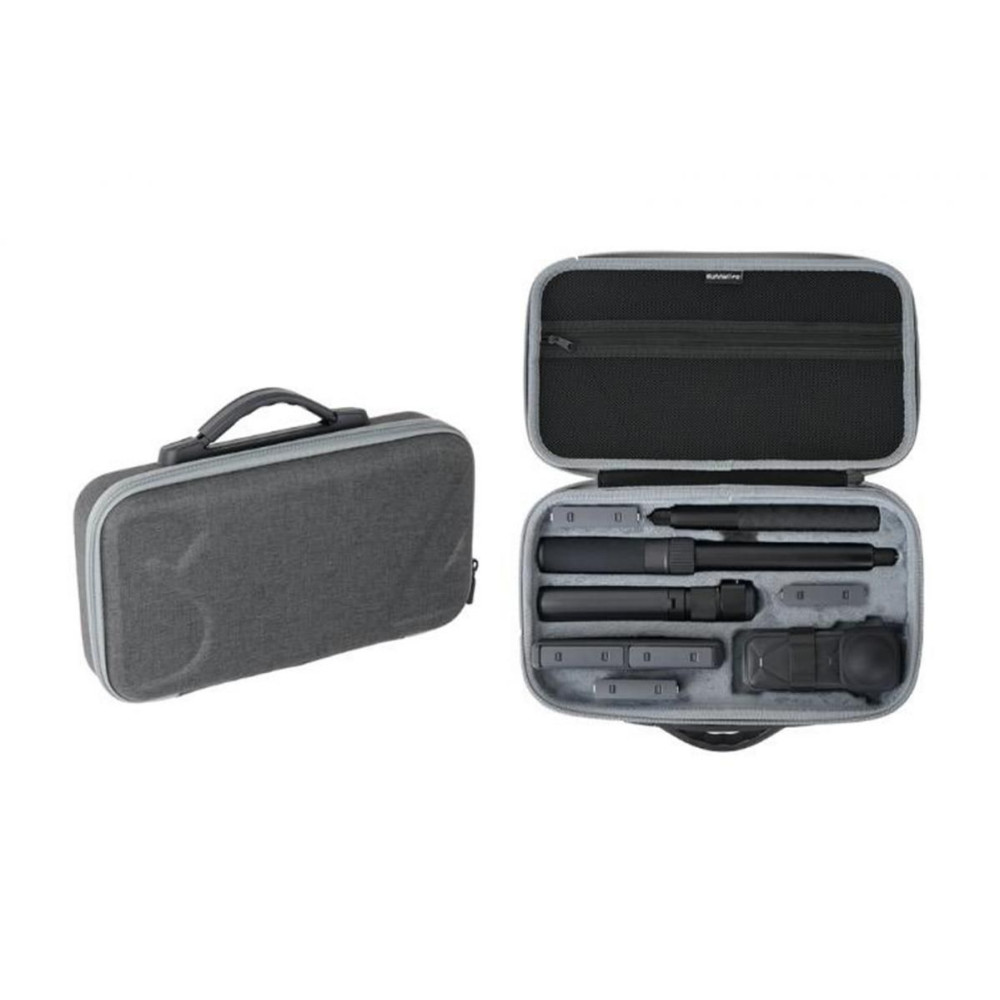 Kemény poliészter tok Insta360 X5 fényképezőgéphez, szürke színben. Poliészterből, EVA-ból és bársonyból készült, súlya 411 g. Méretei 324 x 191 x 67 mm. A tok szilárd védelmet nyújt a fényképezőgépnek és a tartozékoknak, ideális a biztonságos tároláshoz és hordozhatósághoz utazás közben.