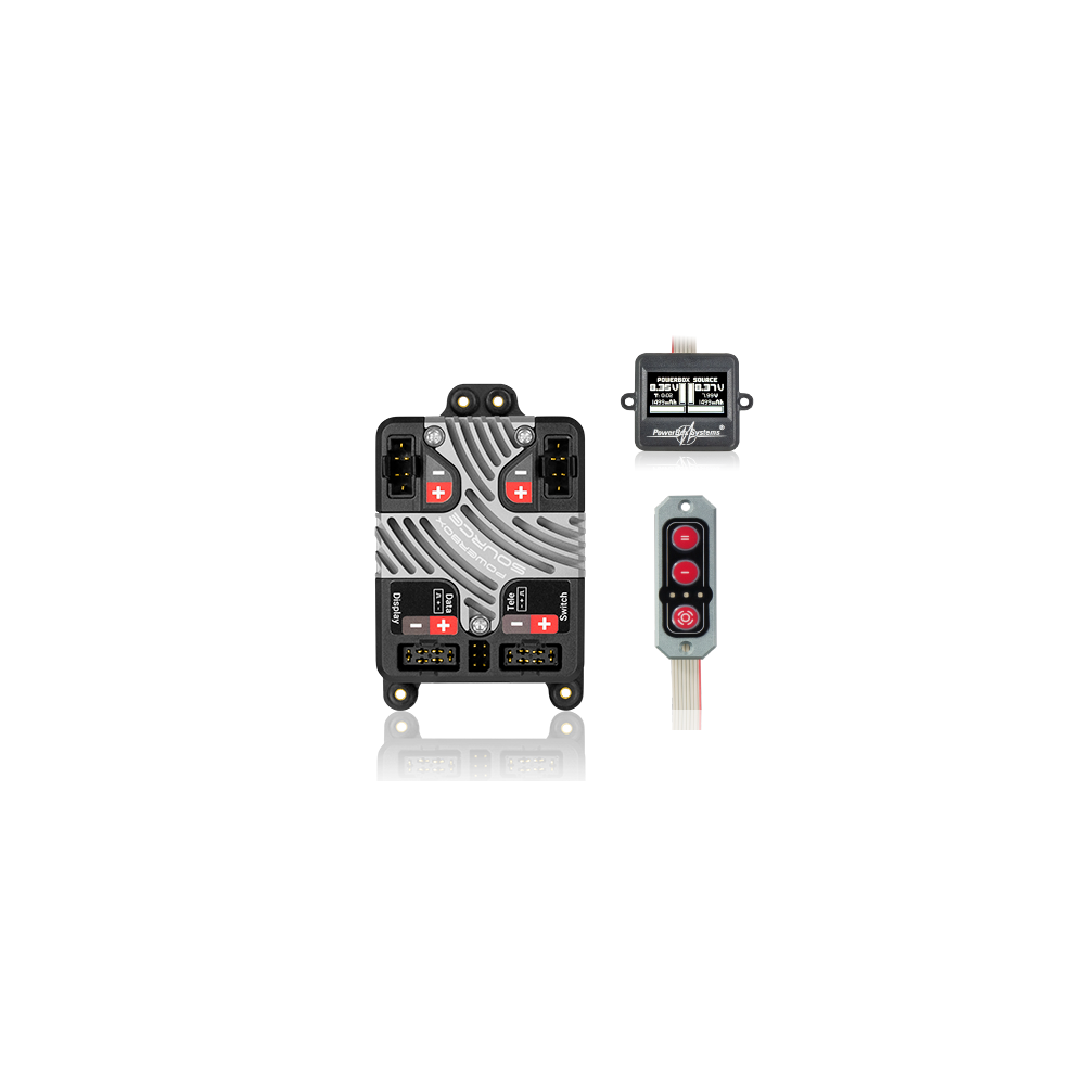 Zdroj PowerBox možno nastaviť na jedno zo štyroch rôznych výstupných napätí: 5,9 V - 7,4 V - 7,8 V a neregulované; v poslednom prípade sa napätie batérie prenáša s minimálnymi stratami. Vstupy a výstupy MPX sú vybavené poistnými svorkami/úchytkami, ktoré zabraňujú vykĺznutiu konektorov pri silných vibráciách.
