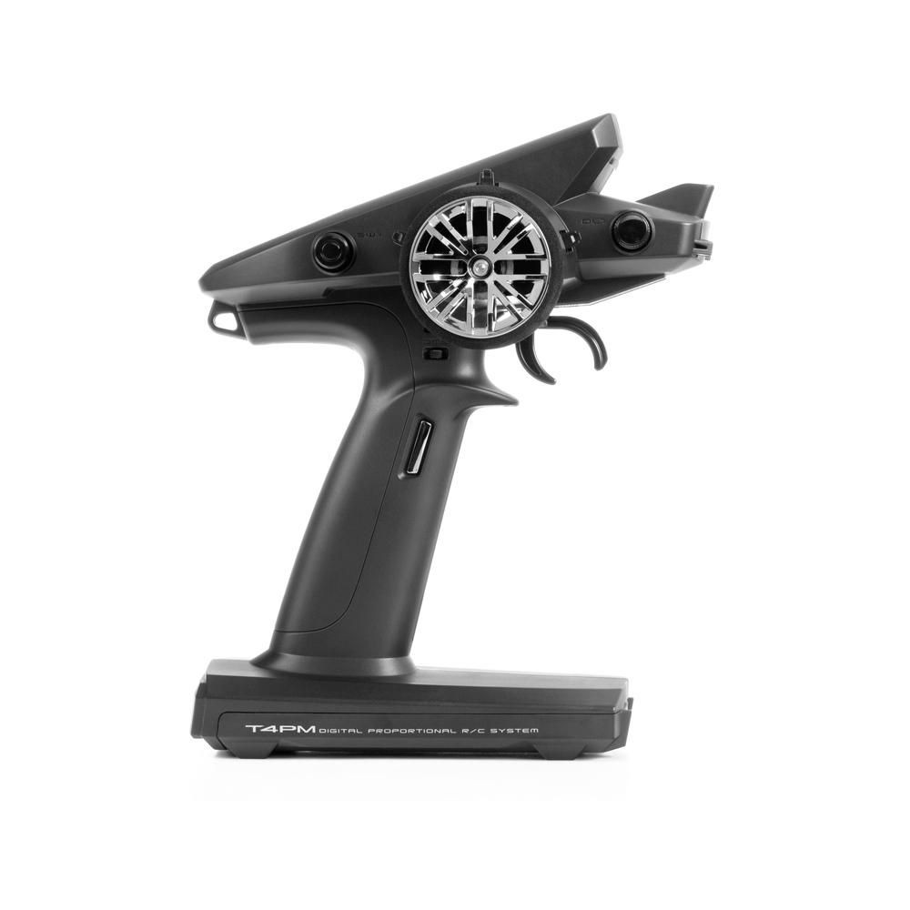 A klasszikus kormánykerék-kialakítású, kézbe tökéletesen illeszkedő fogantyúval ellátott T4PM plus adó kormánykerék-vezérlővel, gázkarral, két nyomógombos kapcsolóval, egy forgókapcsolóval és öt digitális trimmel (3 a kormánykerék körül, 2 a fogantyún) van felszerelve. A programozáshoz három gomb és egy multifunkcionális joystick szolgál; az intuitív menüben való könnyű eligazodást a nagyméretű, háttérvilágítású LCD kijelző biztosítja. A T4PM 40 modell memóriájával és számos fejlett programfunkcióval rendelkezik az általános és speciális autómodellekhez - pl. az első és hátsó kerekek független vezérlése és meghajtása (2 szabályozóval) lánctalpas autókhoz, kétkörös fékek a nagy 1:5-ös modellekhez, giroszkóp a driftelésekhez, ABS, kipörgésgátló, keverék a tartálykocsikhoz stb.