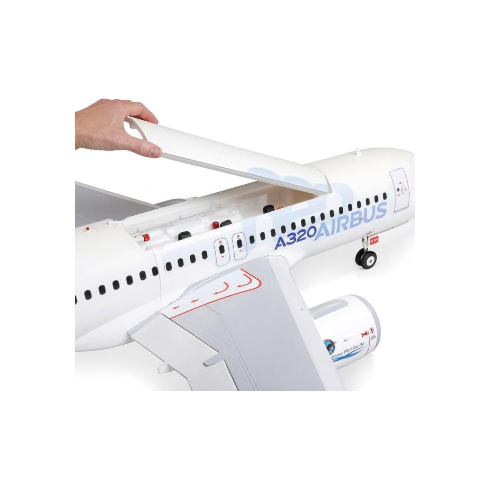 A kompozittal erősített EPO anyagból készült könnyű repülőgéptörzs felületkezeléssel és az Airbus speciális "neo" sémájával érkezik. Az összeszereléshez nincs szükség ragasztóra, a kétrészes szárny egyszerűen felszerelhető a kényelmes autóban való szállítás érdekében. Nyolc digitális szervomotor csatlakozik a kormánylapátokhoz gömbcsuklós összekötőrudakon keresztül, így minden sebességnél precíz és megbízható vezérlést biztosít. A funkcionális jellemzők közé tartozik a LED navigáció, a stroboszkóp és a leszállófények, a fékszárnyak és az elektromos futómű, amely szintén lengéscsillapítókkal és nagy kerekekkel van felszerelve, így nemcsak kemény, sík felületekről, hanem füves területekről is fel- és leszállhat. Mindez együtt egy olyan polgári repülési ikonmodellt alkot, amellyel repülésről repülésre élvezni fogja!