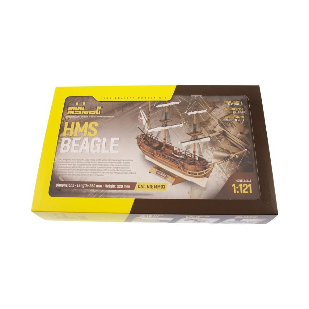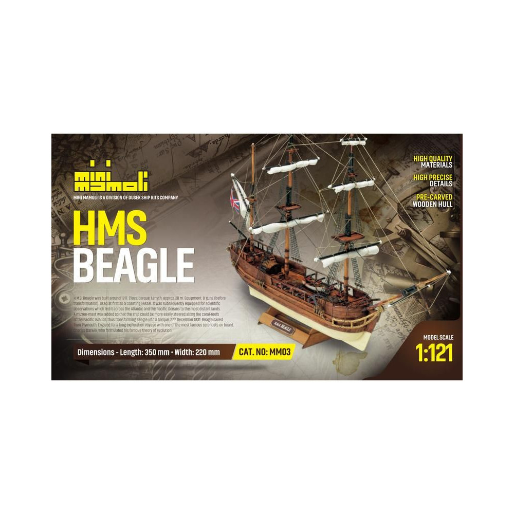 A H.M.S. Beagle modellje a Mini Mamoli sorozatból, 1:121 méretarányban. A Brit Királyi Haditengerészet hajóját először parti őrhajóként használták, később az ágyúk eltávolítása után tudományos célokra használták az Indiai- és Csendes-óceánon. Kezdő modellezők számára is alkalmas. A modell néhány óra alatt összeszerelhető. Alkalmas 14 éves kortól.