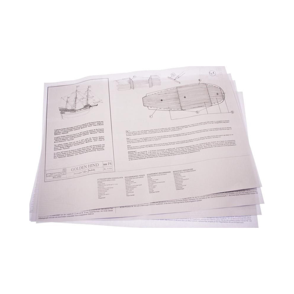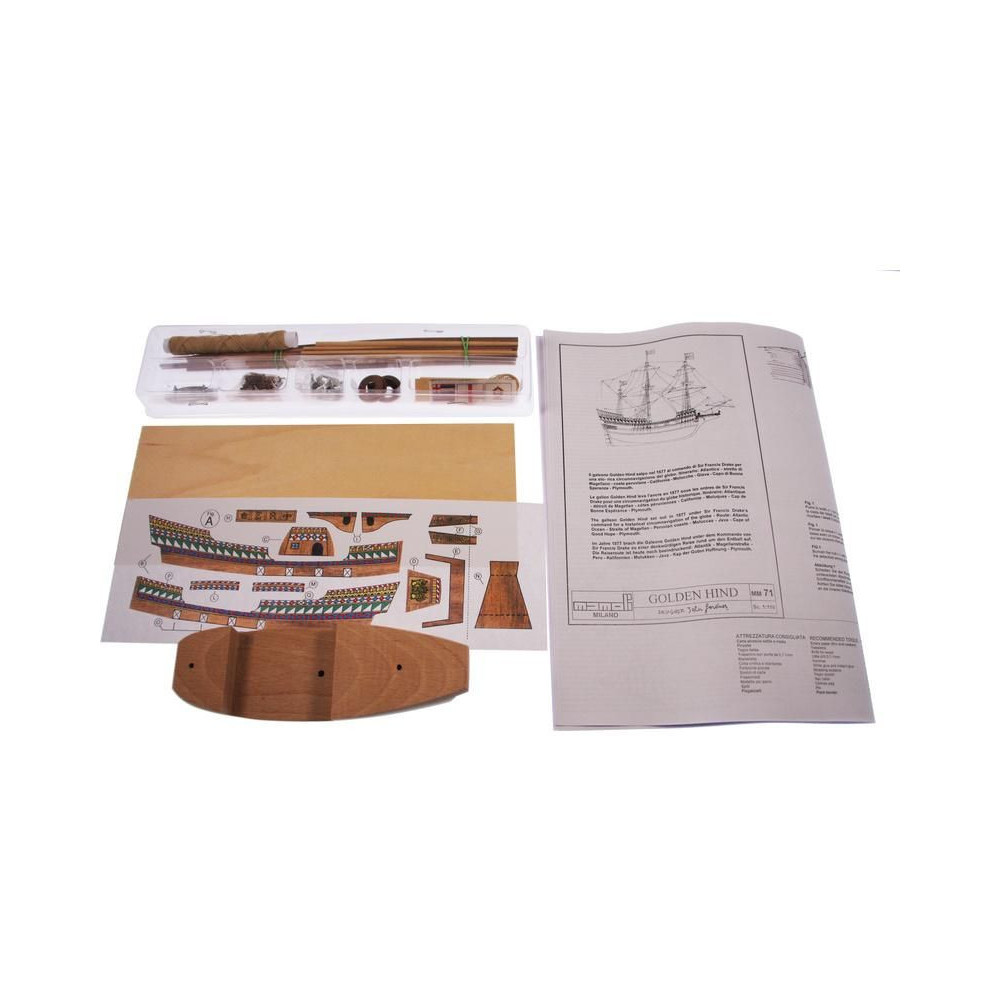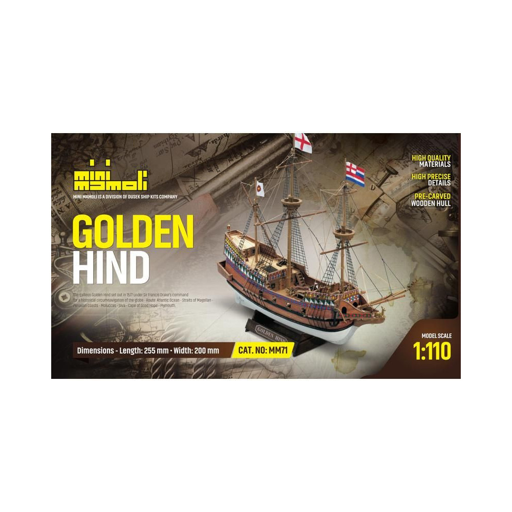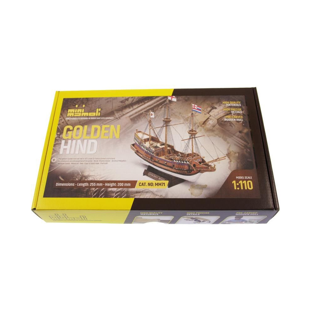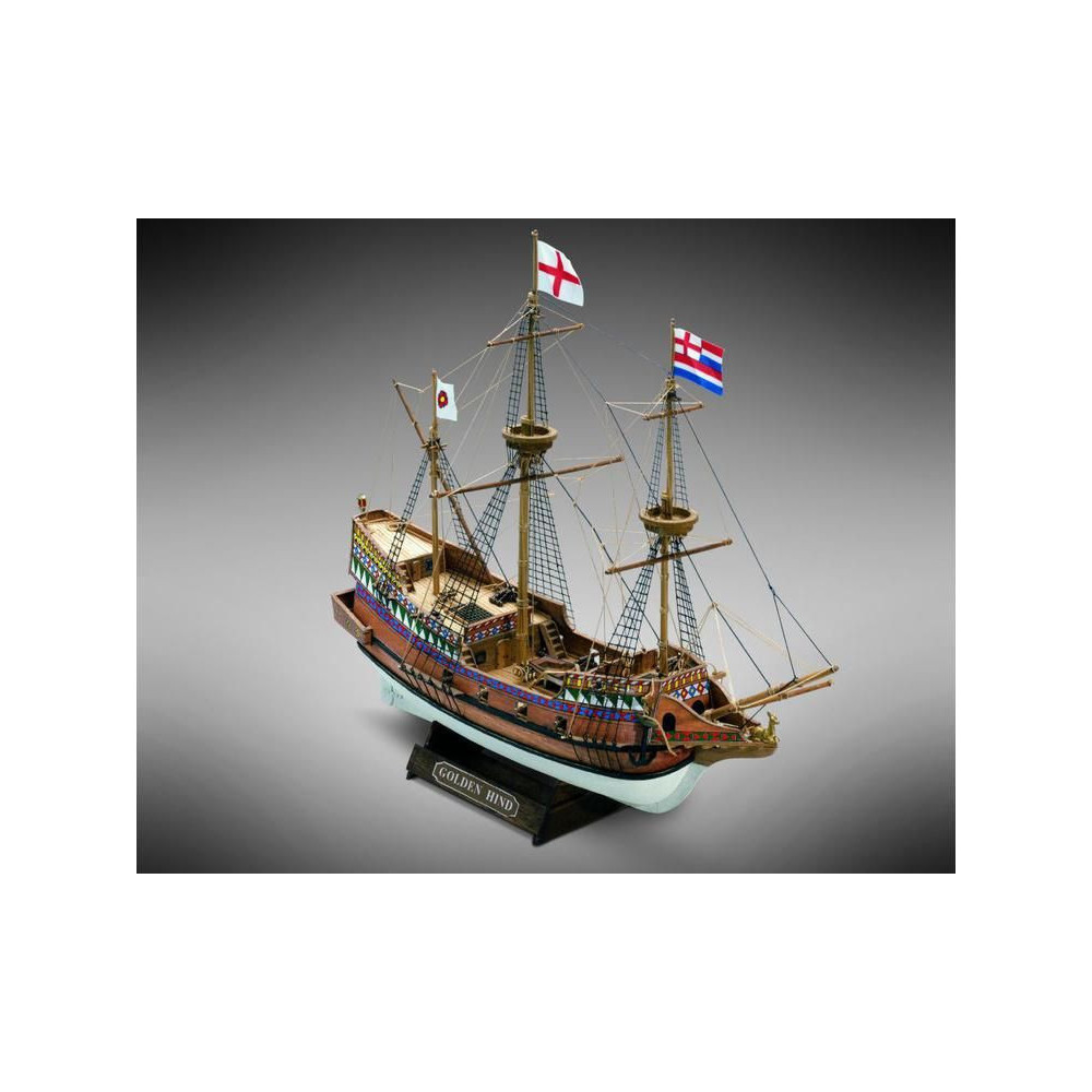 A Golden Hind 1:110 méretarányú modellje a Mini Mamoli sorozatból. Az Arany Hind Francis Drake zászlóshajója volt, amelyen 1577-1580-ban megkerülte a Földet. A készlet faragott fa alkatrészeket, fém alkatrészeket, állványt és útmutatót tartalmaz.