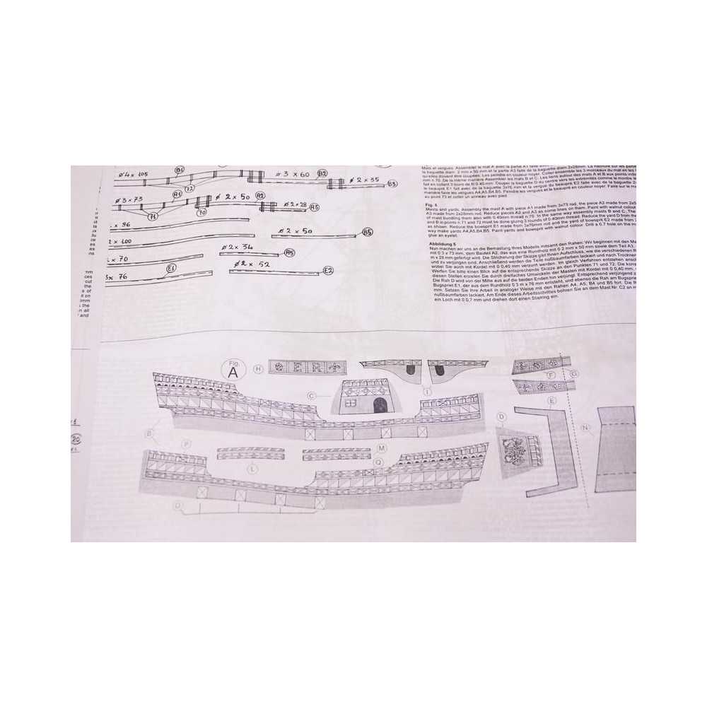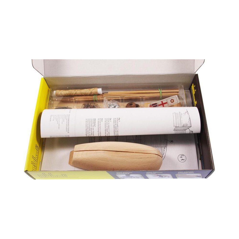 A doboz fedelét kinyitva a modell rétegelt lemezből készült fa alkatrészeit, egy öntvénykészletet, műanyag átlátszó buborékcsomagba zárt kis alkatrészeket, egy rajzkészletet és egy kézikönyvet talál.