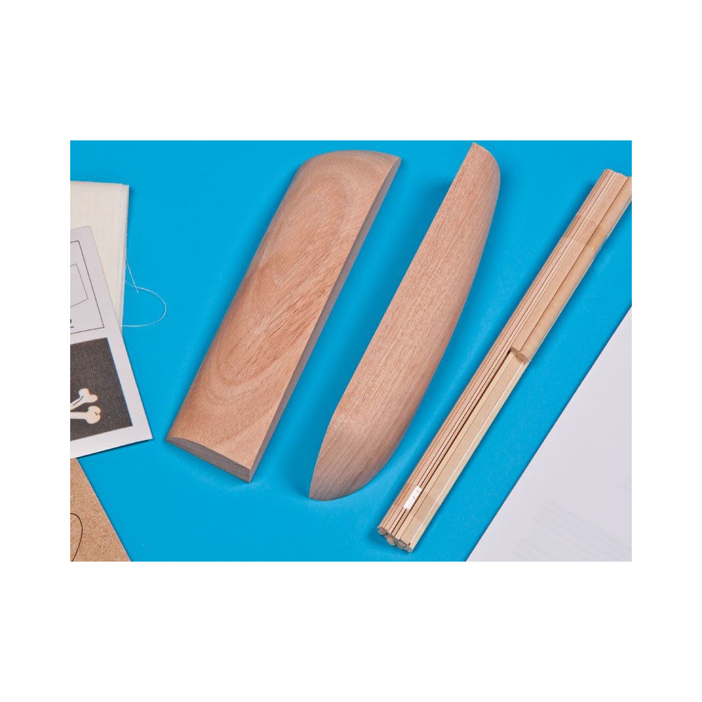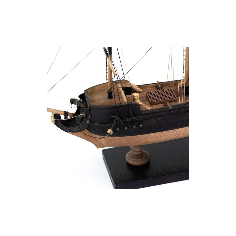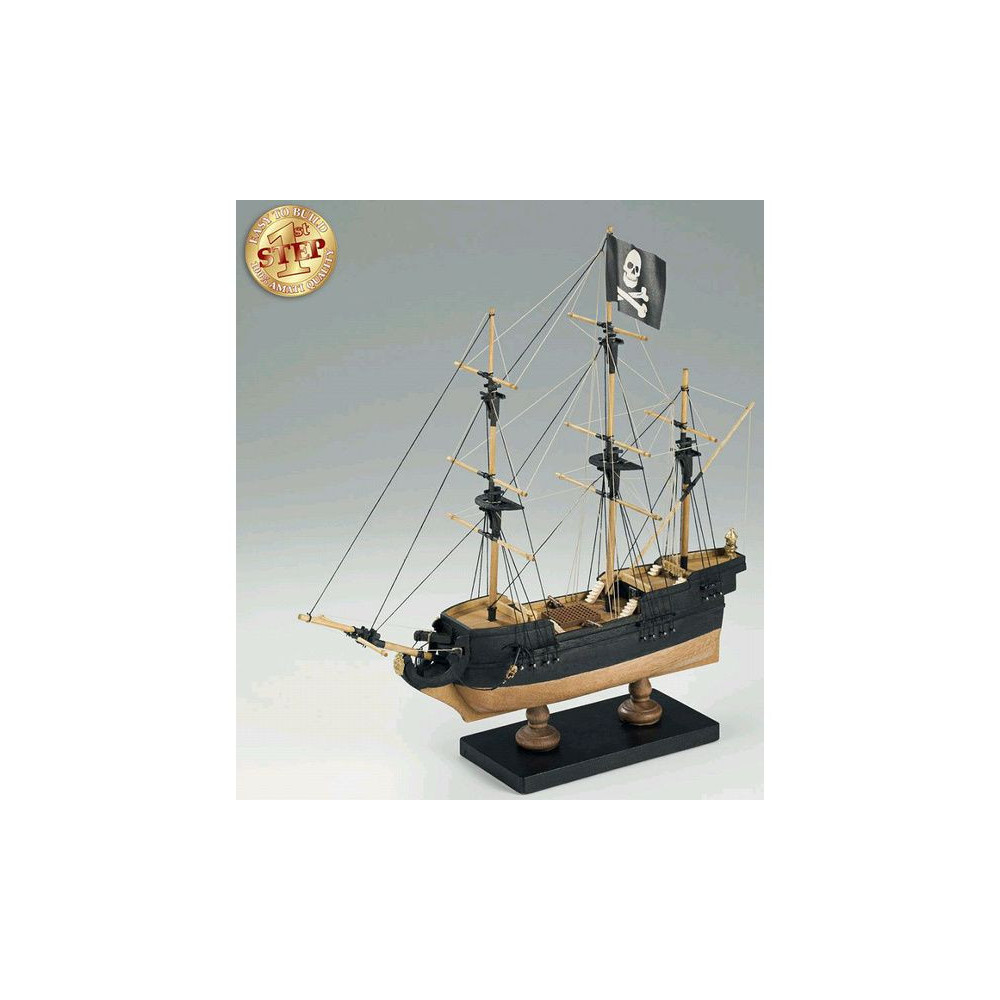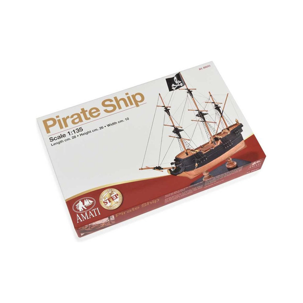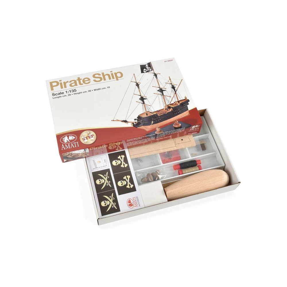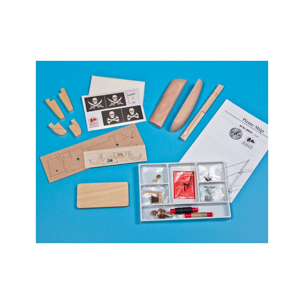 AMATI AMATI kalózhajó 1:135 Első lépés készlet. A kalózhajók az egyik legnépszerűbb hajómodellek közé tartoznak, ezért a First step kit sorozatot a kezdők számára hozták létre. A készlet tartalmaz egy kész fából készült hajótestet, kivágásokkal ellátott kiel-t és apró kiegészítőket. A vitorlákat nem tartalmazza.