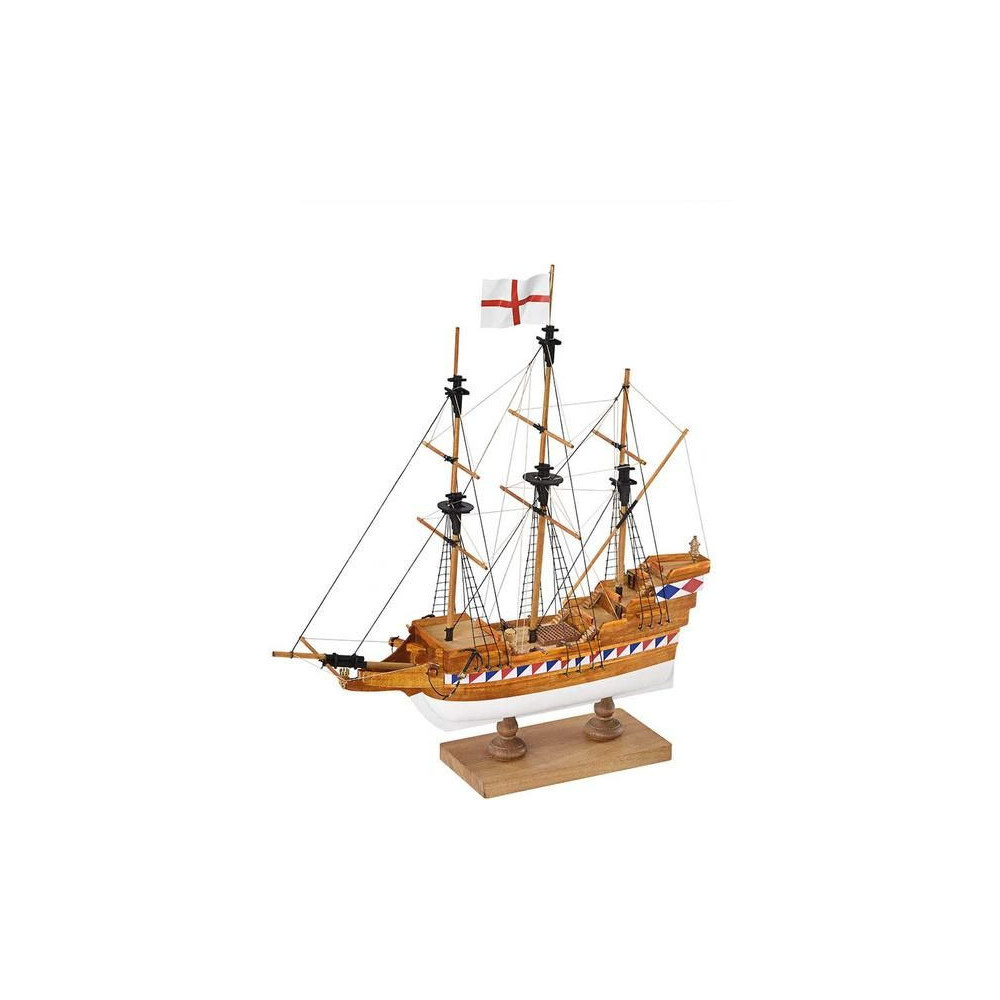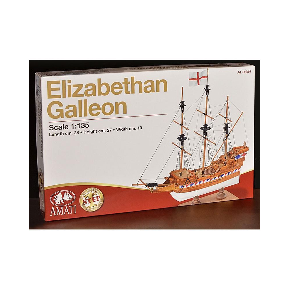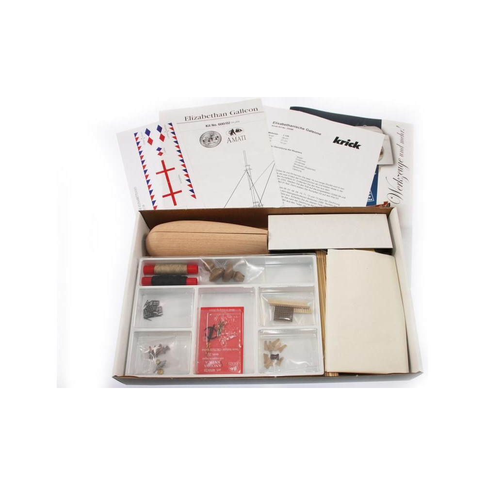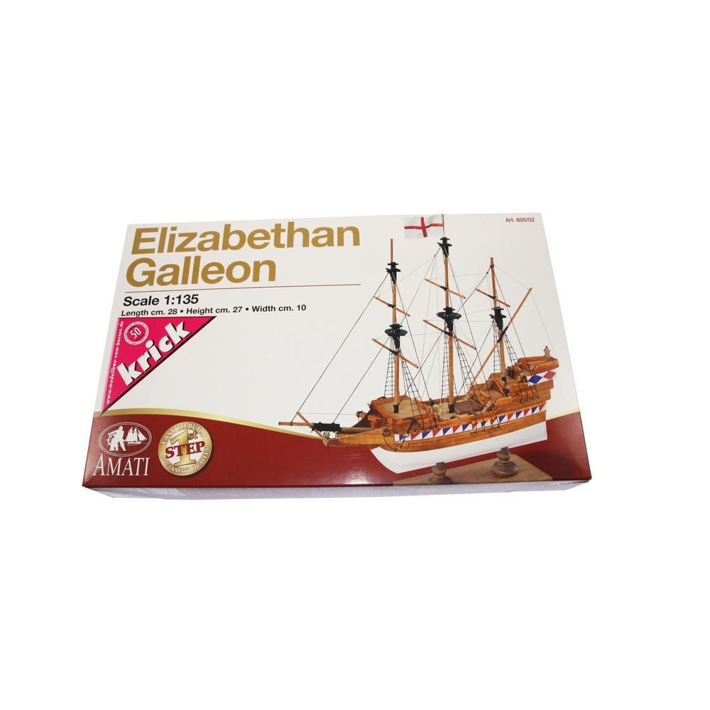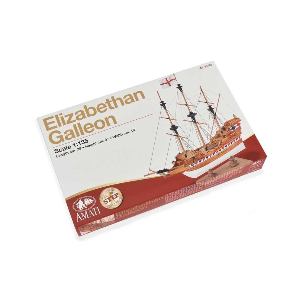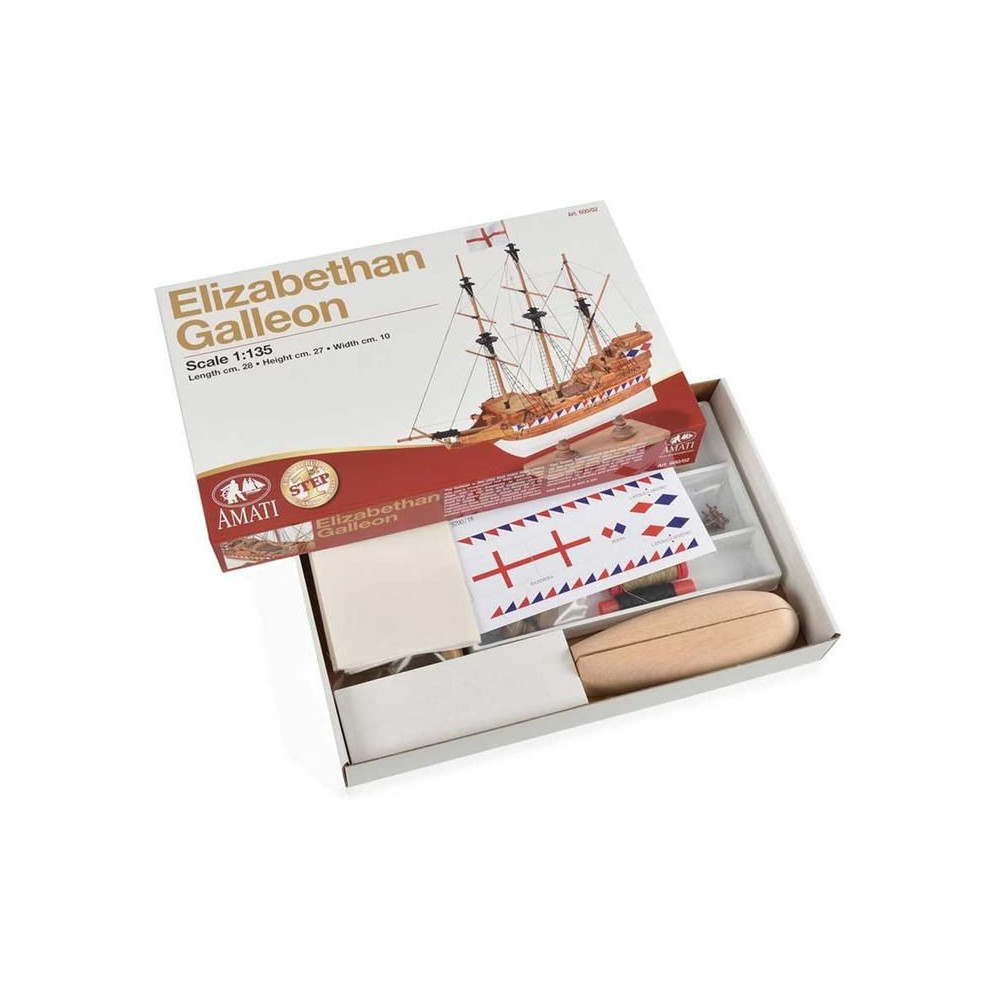 AMATI Galleon 1:135 Első lépés készlet. A történelmi hajók az egyik legnépszerűbb hajómodellek közé tartoznak, ezért a First step kit sorozatot a kezdők számára hozták létre. A készlet tartalmaz egy kész fából készült hajótestet, kivágásokkal ellátott kiel-t és apró kiegészítőket. A vitorlákat nem tartalmazza.