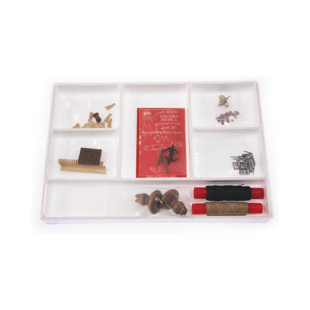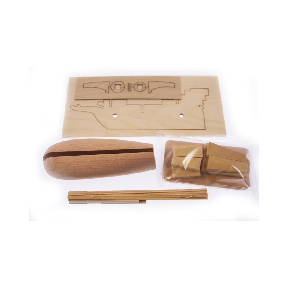 A doboz fedelét kinyitva a modell fa alkatrészeit, műanyag átlátszó buborékcsomagolásba zárt kis alkatrészeket és egy rajzkészletet talál.