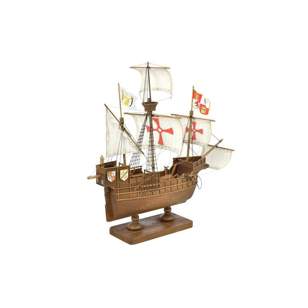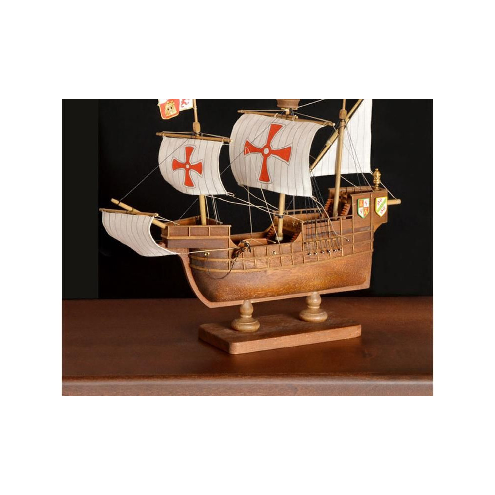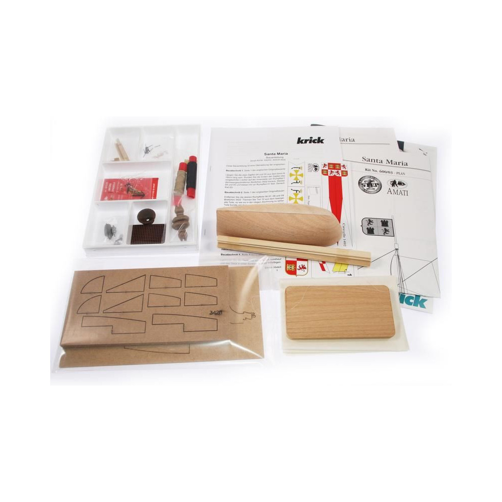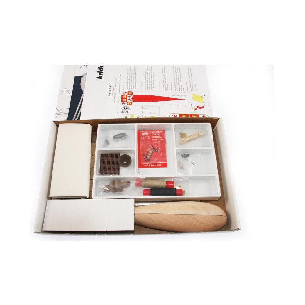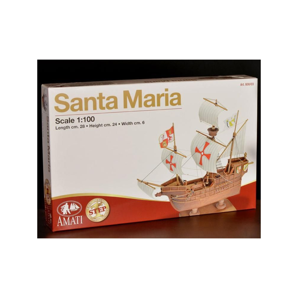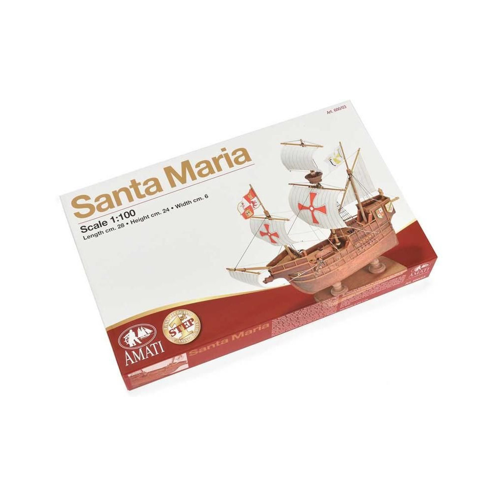 AMATI Santa Maria 1:100 Első lépés készlet. A történelmi hajók az egyik legnépszerűbb hajómodellek közé tartoznak, ezért a First step kit sorozatot a kezdők számára hozták létre. A készlet tartalmaz egy kész fából készült hajótestet, kivágásokkal ellátott kiel-t és apró kiegészítőket. A vitorlákat nem tartalmazza.