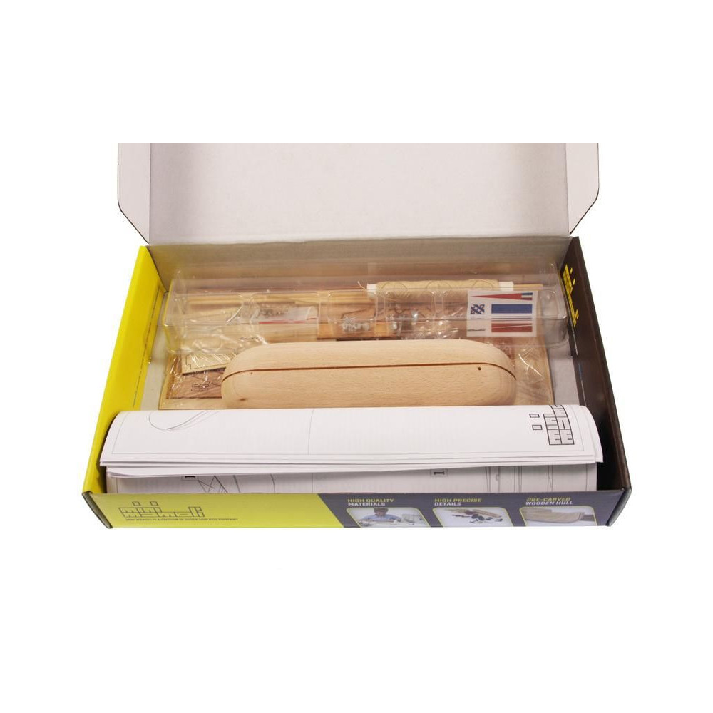 A doboz fedelét kinyitva a modell rétegelt lemezből készült fa alkatrészeit, egy öntvénykészletet, műanyag átlátszó buborékcsomagba zárt kis alkatrészeket, egy rajzkészletet és egy kézikönyvet talál.
