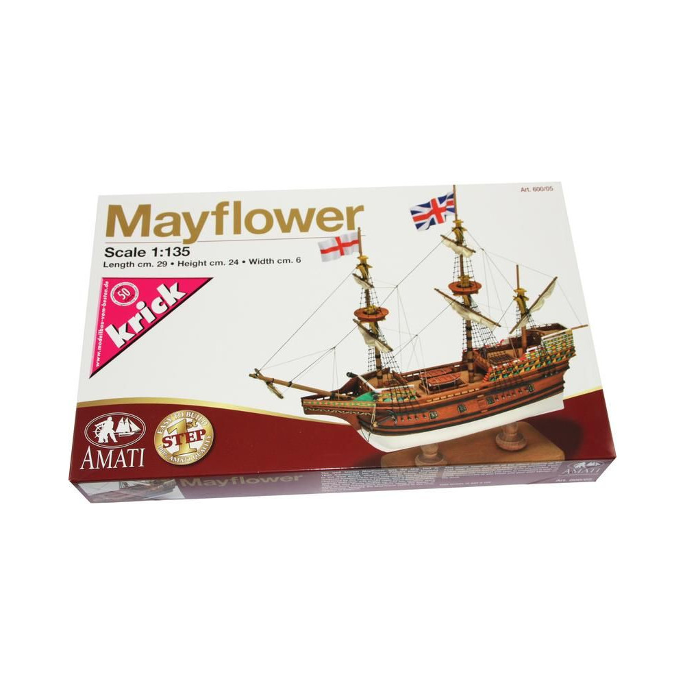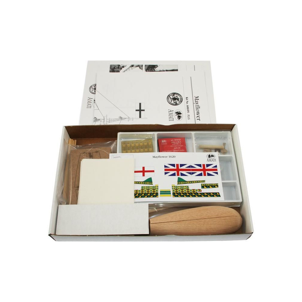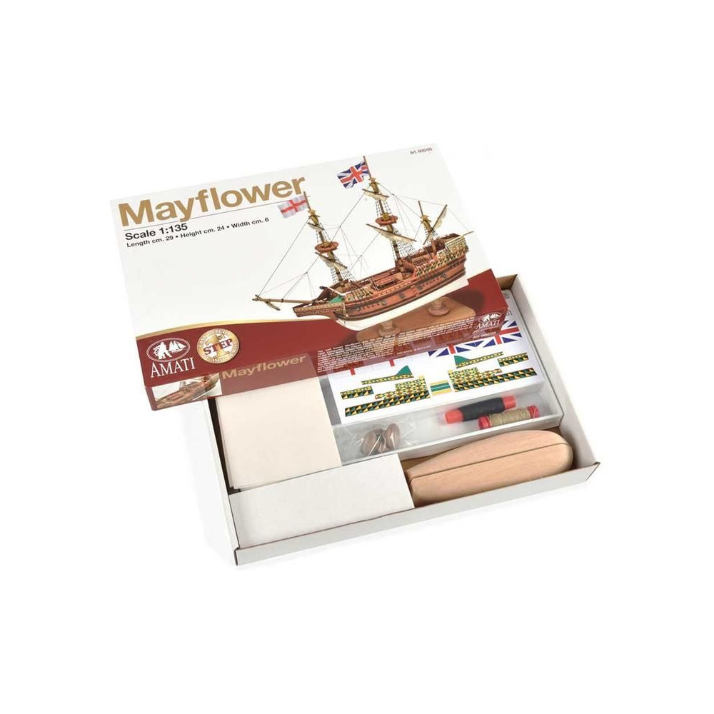 Metszetek az AMATI Mayflower 1:135 méretarányú, 1620-ból származó modellkészletéhez. A Mayflower az angol puritánokat szolgálta, útban az új világ felé 1620-ban. A Mayflower az Amati "First Step" sorozatának egyik, kezdőknek szánt készlete. A kiváló minőségű előgyártásnak köszönhetően az építés egyszerű.