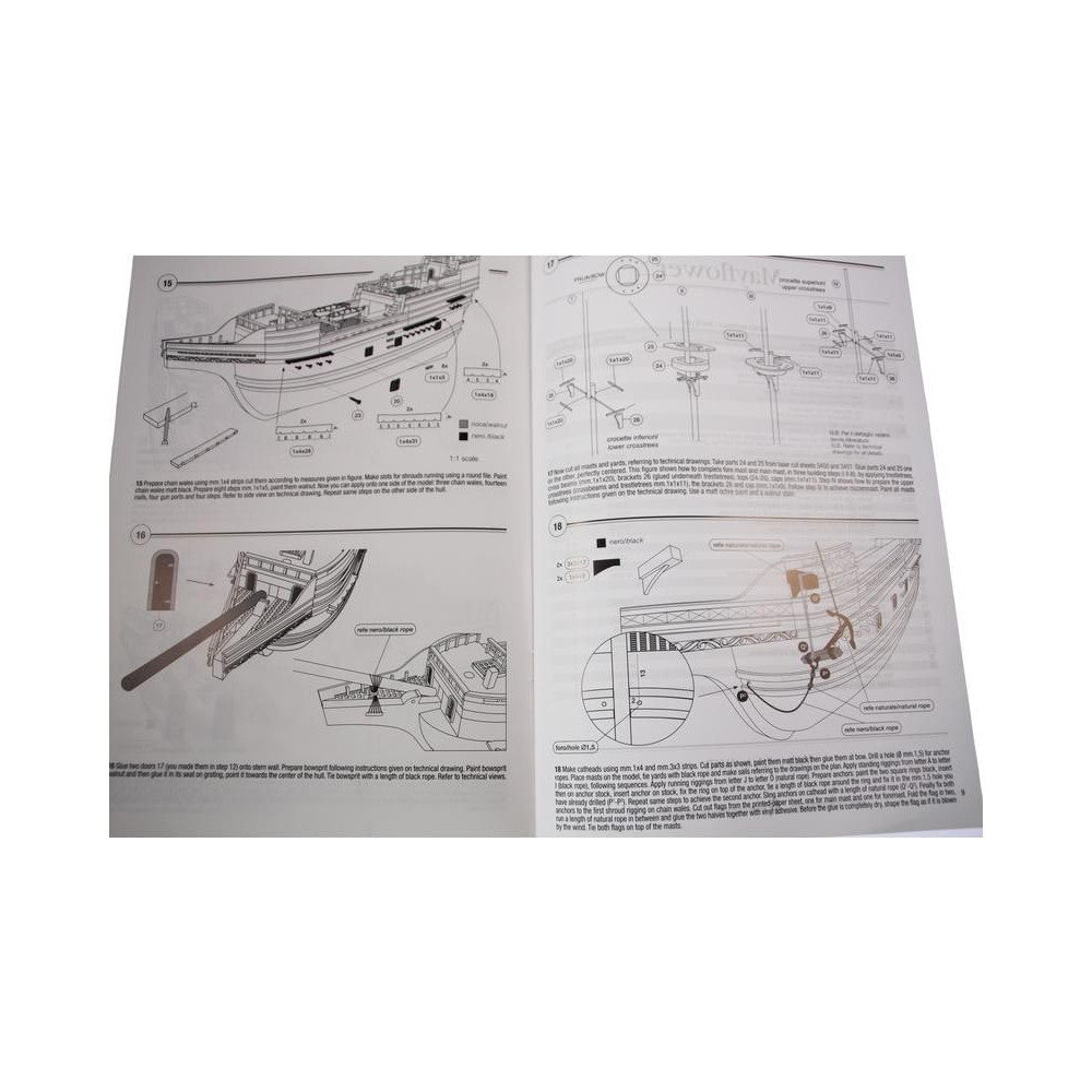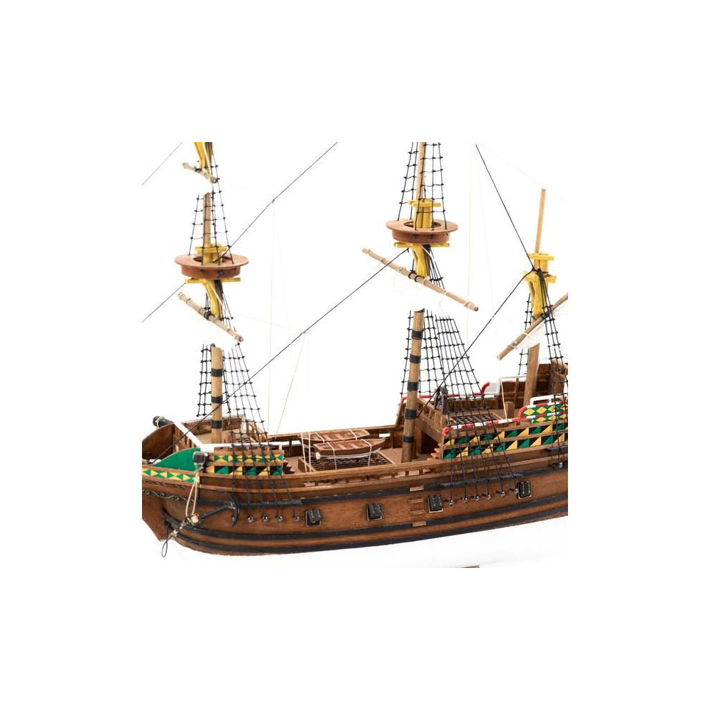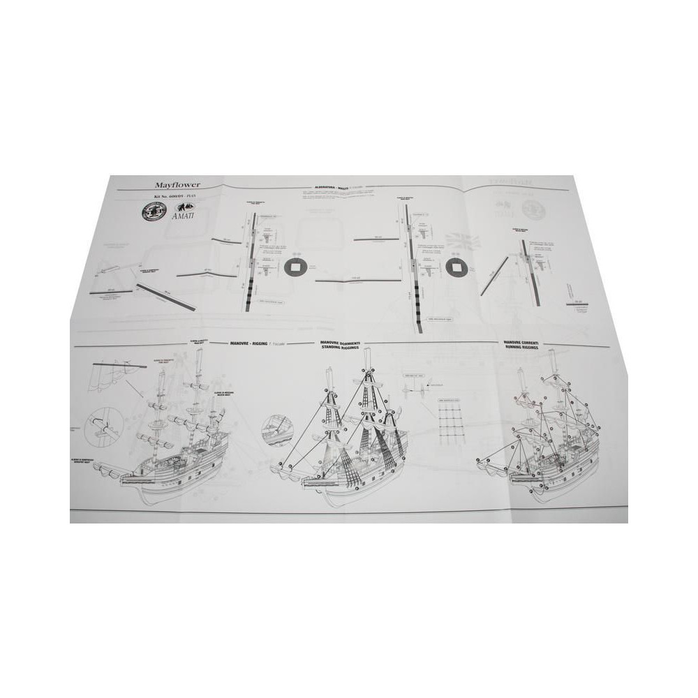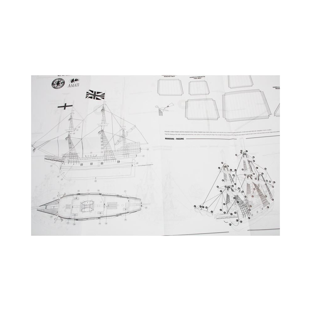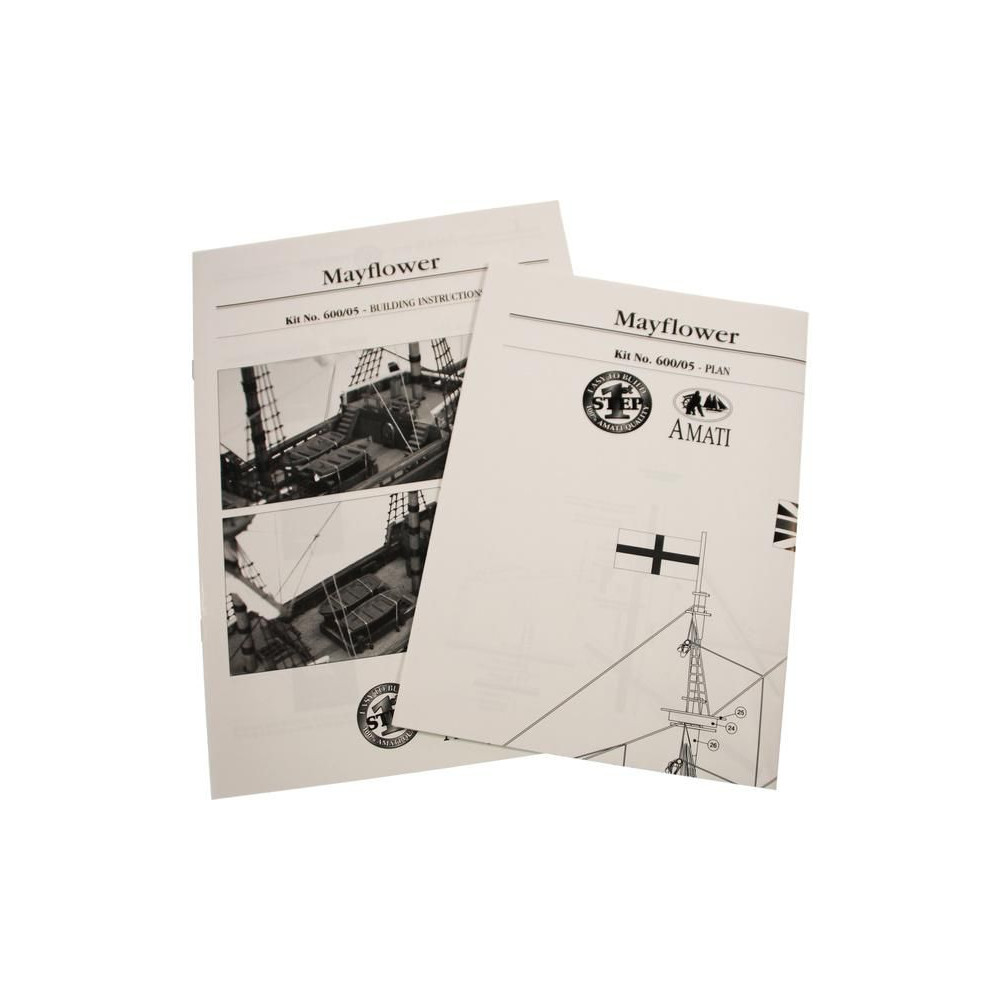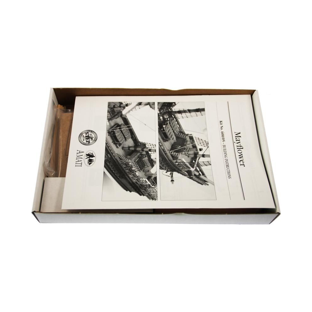 Metszetek az AMATI Mayflower 1:135 méretarányú, 1620-ból származó modellkészletéhez. A Mayflower az angol puritánokat szolgálta, útban az új világ felé 1620-ban. A Mayflower az Amati "First Step" sorozatának kezdőknek szánt készlete. A kiváló minőségű előgyártásnak köszönhetően az építés egyszerű.