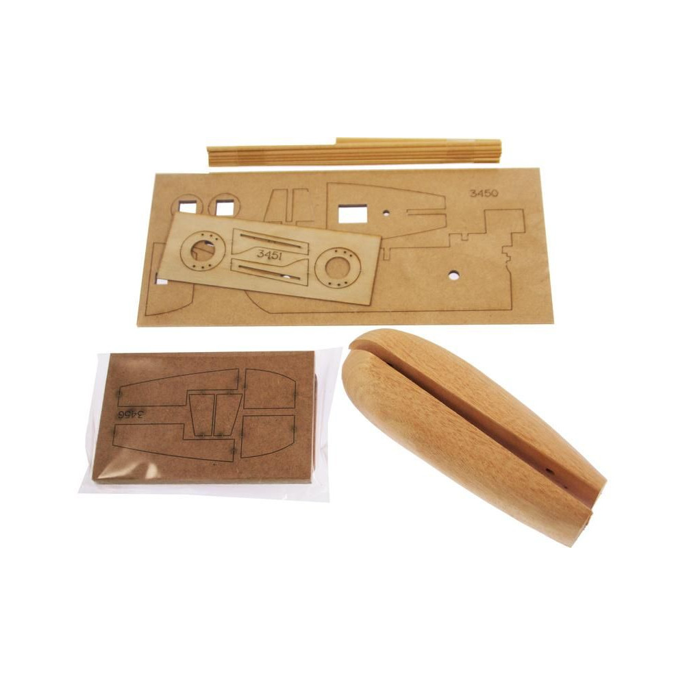 A doboz fedelét kinyitva a modell fából készült rétegelt lemezből készült alkatrészeit, egy öntvénykészletet, műanyag átlátszó buborékcsomagba zárt kis alkatrészeket, egy rajzkészletet és egy kézikönyvet talál.