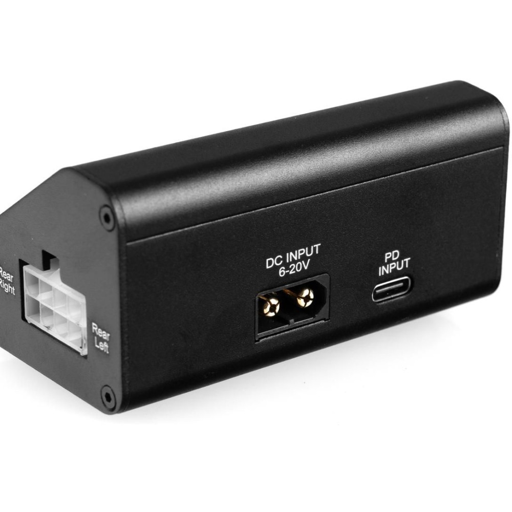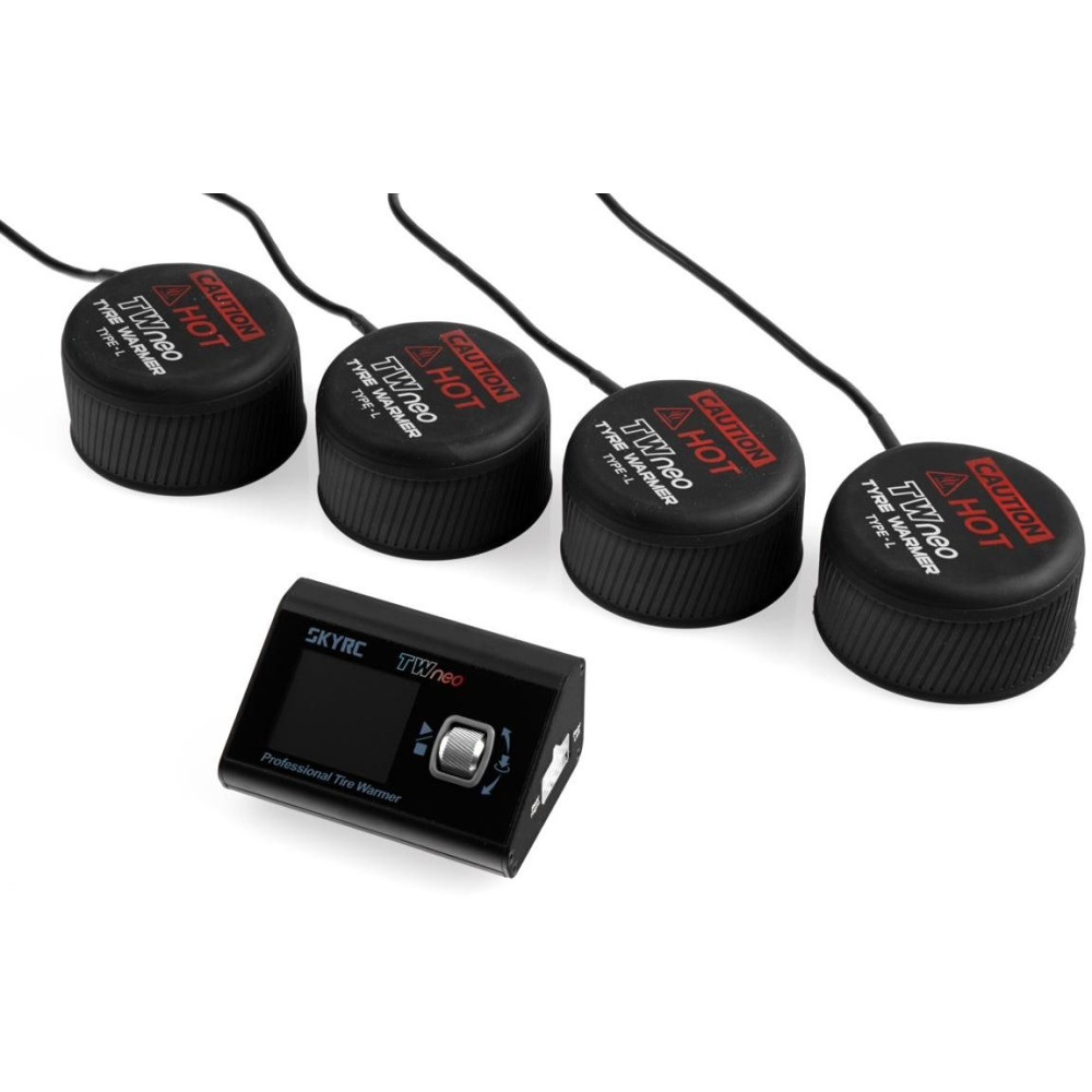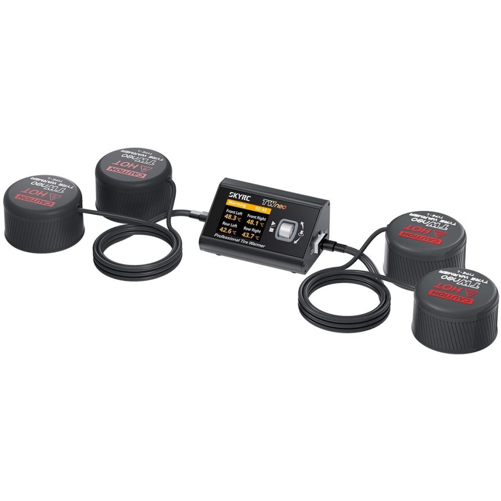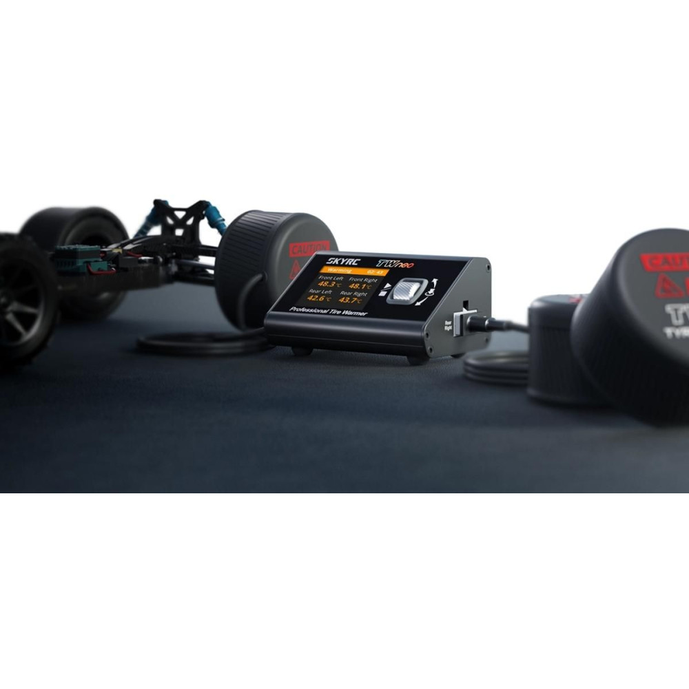 A Tire Warmer neo gumiabroncs-előmelegítő egy kijelzős vezérlőegységből és két pár fűtőhüvelyből áll, amelyeket az autóabroncsokra kell helyezni. Az előmelegítőt nagy kapacitású akkumulátorról (pl. 4S LiPo) vagy stabilizált 6-20 V-os tápegységről lehet táplálni, amely legalább 10 A áramerősséget képes leadni. Alternatív megoldásként használhat nagy teljesítményű USB-C forrást/töltőt PD protokollal (20 V, 100 W).