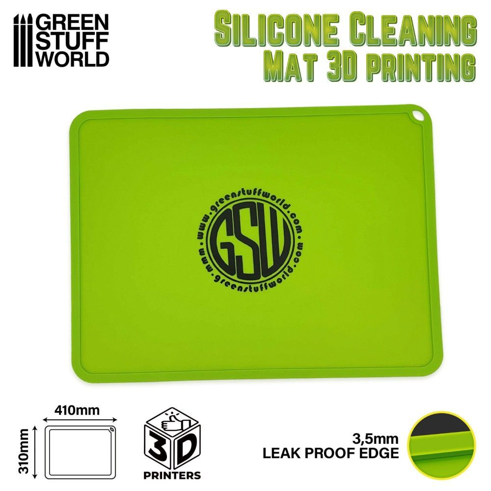 A Green Stuff World szilikon tisztítószőnyeg emelt szélekkel tökéletes hobbi kiegészítőként szolgálhat bármely 3D gyantanyomtató felhasználó vagy festő számára. Rugalmas szilikonból készült, így könnyen feltekerhető és bármilyen hobbitáskába belefér. A teljes kerületén 3,5 mm magas kontúrral rendelkezik, hogy megakadályozza a gyanta, a tisztítóalkoholok és akár a festékek kiömlését is.
