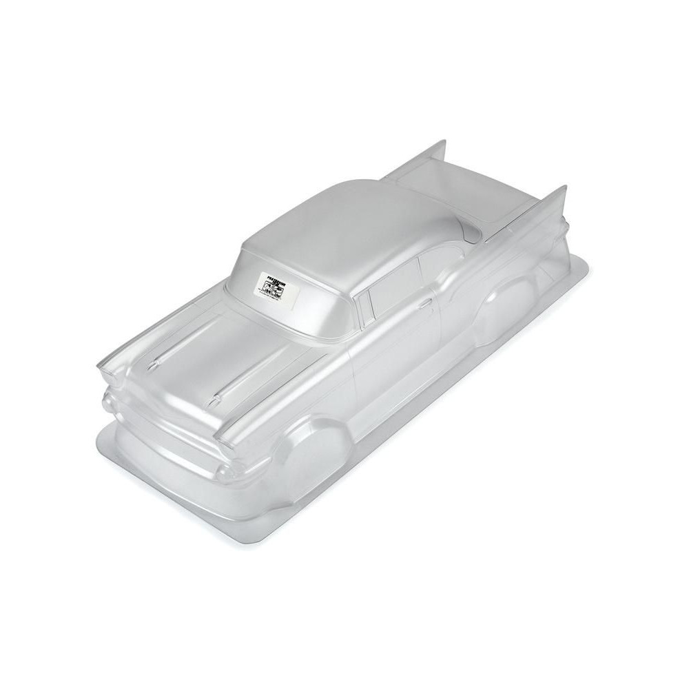 Pro-Line karosszéria tiszta Chevy Bel Air 1957 "Avenger Edition", 1:8-as RC autó modellekhez, tengelytáv 330mm, hossz 564mm, szélesség 210mm, magasság 180mm. Tartós lexánból készült. Alkalmas 1:8-as Monster Truck modellekhez.