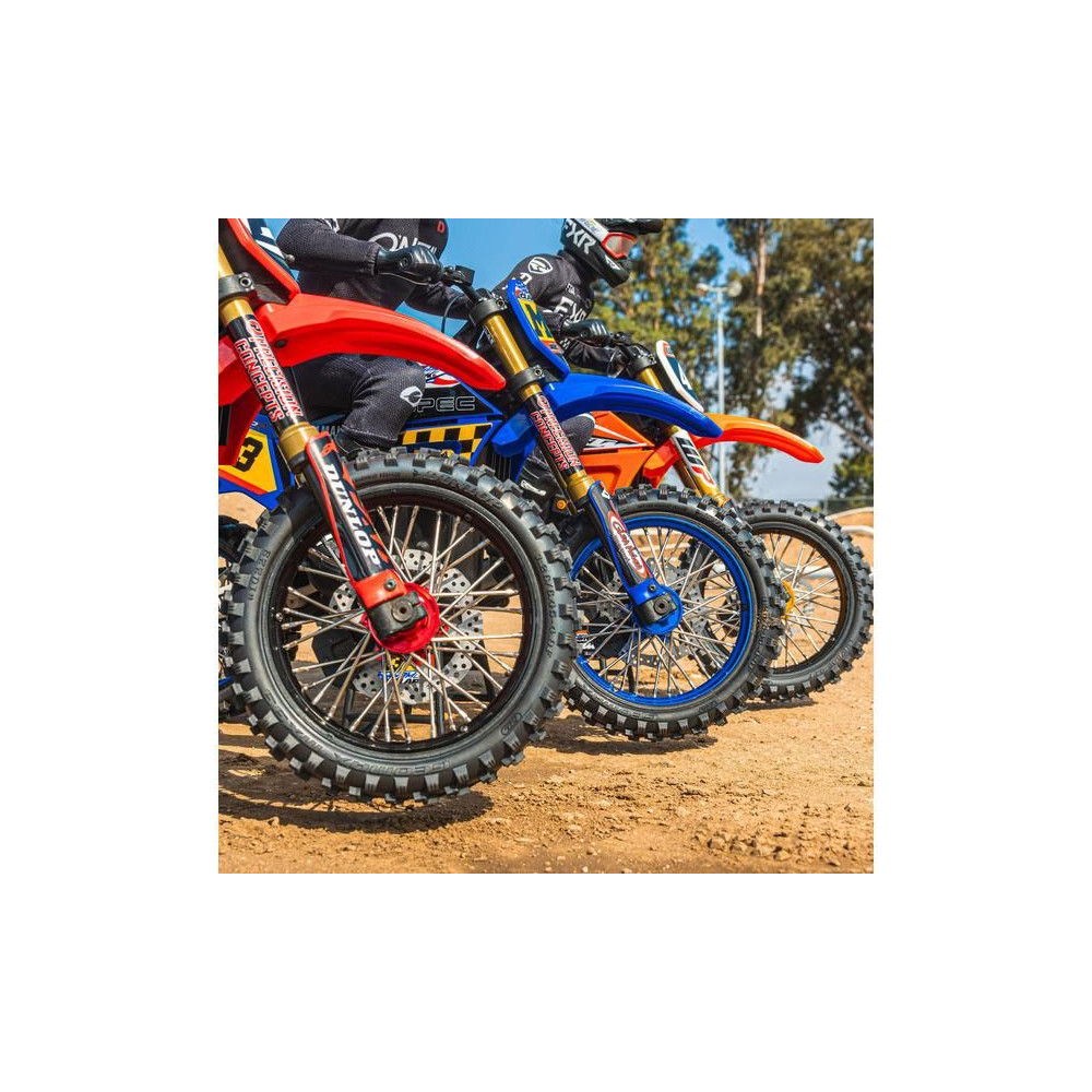Összeszerelt Pro-Spec V2 Bead alumínium első kerék a Losi® Promoto-MX-hez. A Pro-Line a motocross realizmusát a következő szintre emeli ezzel a Pro-Spec eloxált alumínium küllős kerékkel. Ezt a kereket a rajongóknak tervezték, és úgy tervezték, hogy extrém körülmények között is jól teljesítsen és jól kezelje a terhelést. A teljes méretű kerekekhez hasonlóan ez a kerék is 6061-es eloxált alumínium kerékagyat és felnit tartalmaz, horganyzott acél küllőkkel, amelyek gyárilag össze vannak szerelve és precíziósan formázva. A V2 Bead gumihüvely segítségével ezek a kerekek könnyen felszerelhetők a Pro-Line V2 Bead MX gumiabroncsokra. A szerelőhüvely biztonságos illeszkedést biztosít a gumiabroncsok előszereléséhez és Pro-Spec alumínium keréktárcsára cseréléséhez.