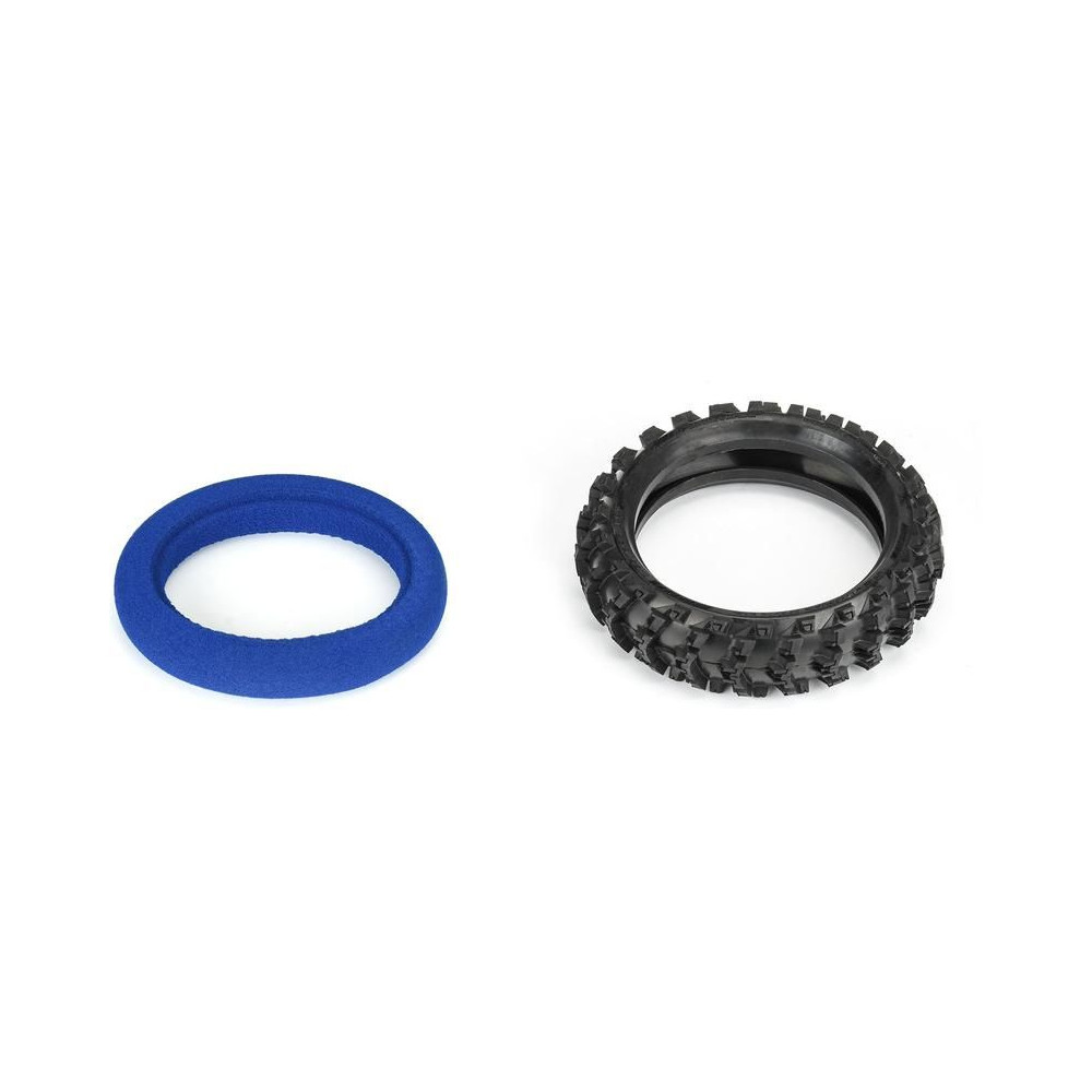A Dunlop Geomax MX14 V2 Bead M2 mintázatú Pro-Line 1:4 gumiabroncs a Losi Promoto-MX motorkerékpár Proline Bullyspoke tárcsával (PRO283303) ellátott hátsó kerekére készült. A csomag egy kiváló minőségű, tartós, zárt cellás betétet tartalmaz.