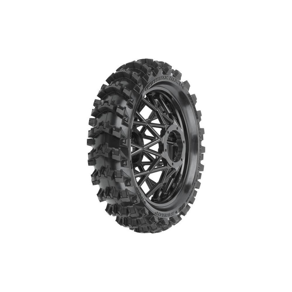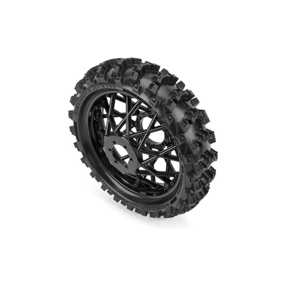 A Dunlop Geomax MX14 gumiabroncs a Pro-Line fekete Bullyspoke V2 Bead felnijére van szerelve, amely tartósság és esztétika szempontjából is előnyökkel jár. A küllők vastagságát megnövelték, hogy megakadályozzák a görbülést erős ütések esetén. A küllők a kerék felnijén találhatók, ami megfelel az igazi motocrossnak. A gumiabroncs belsejében egy kiváló minőségű, tartós, zártcellás betét található.