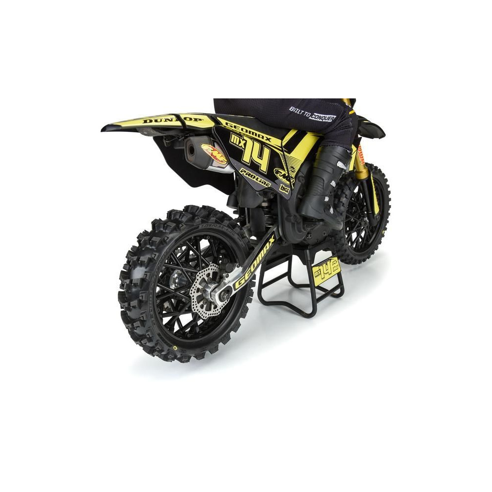 Ajánlott kiegészítők a Losi® Promoto-MX RC motorkerékpárhoz: Pro-Line kerék Dunlop Geomax MX14 V2 Bead CR4 hátsó gumiabronccsal, fekete tárcsafék. Dunlop Motorcycle Tires licencelt gumiabroncsa V-profilú kialakítással előrehaladáshoz, egyenes szakaszokon és kanyarkijáratokon való használatra.