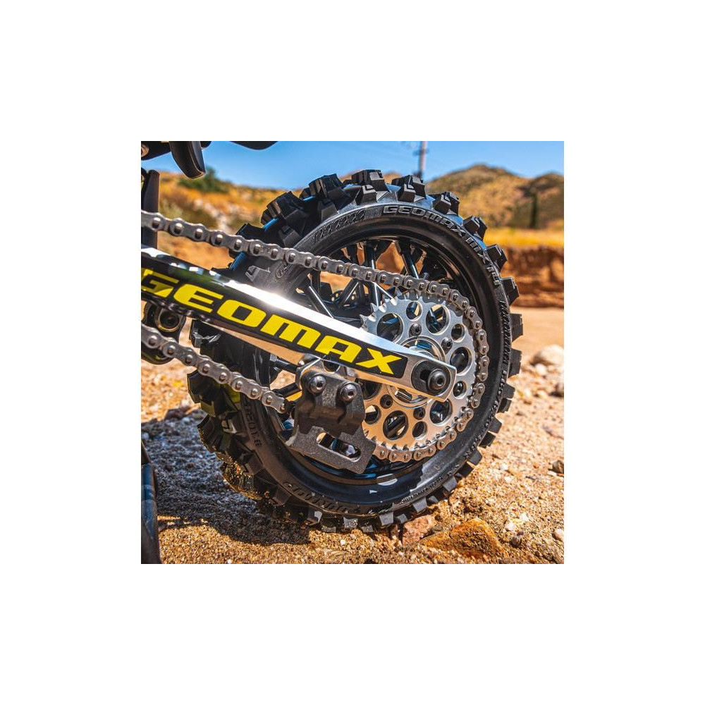Ajánlott tartozékok a Losi® Moto-MX RC motorkerékpárhoz: Pro-Line kerék Dunlop Geomax MX14 V2 Bead CR4 hátsó gumiabronccsal, fekete tárcsafék, fekete tárcsával. Engedéllyel rendelkező V-lamellás gumiabroncs az előrehaladáshoz, egyenesekben és a kanyarokban való kijáratoknál.