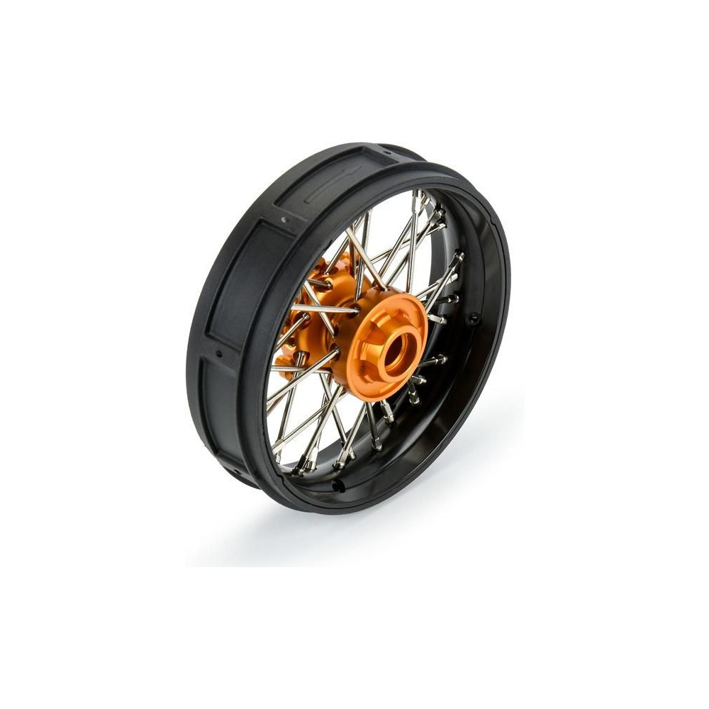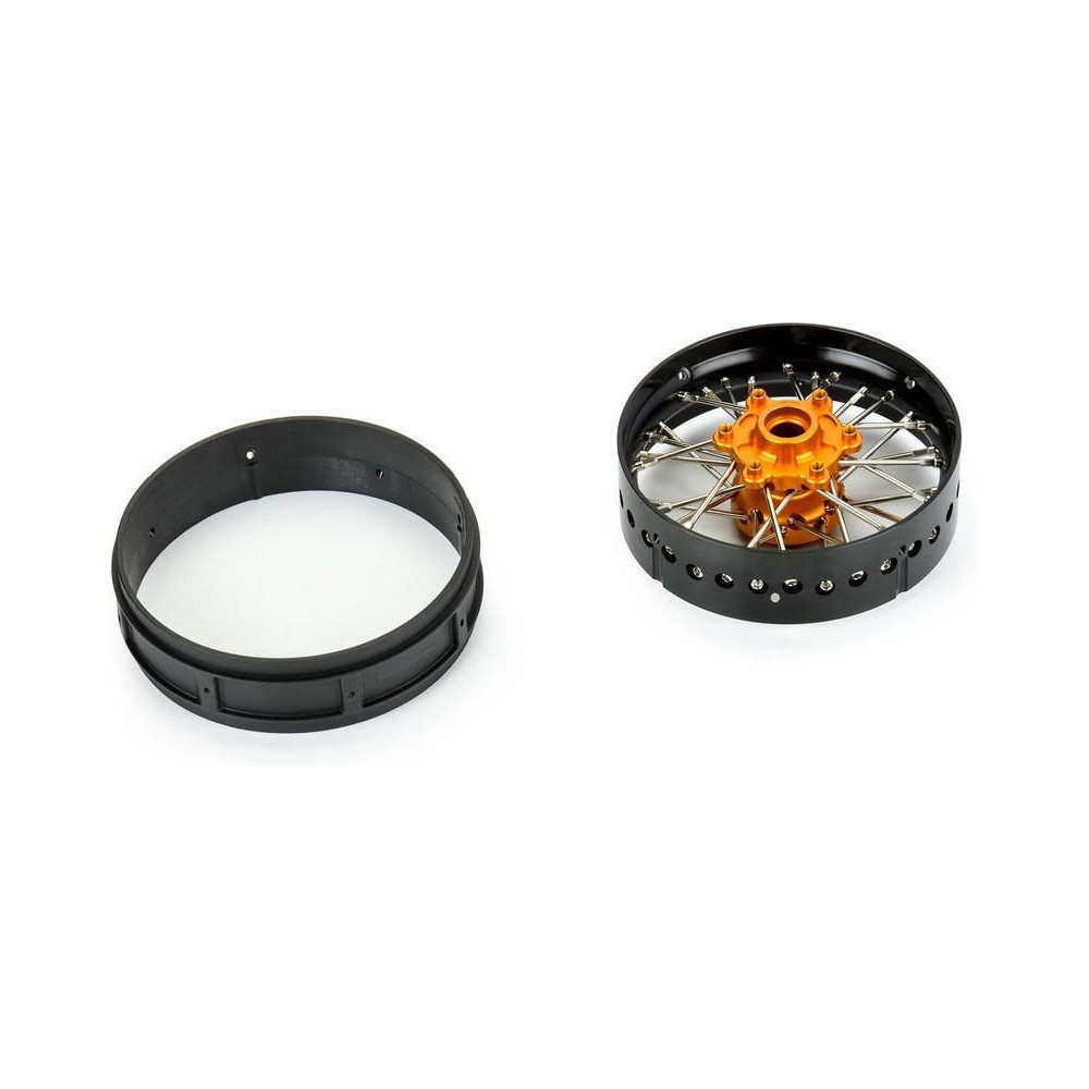 Összeszerelt Pro-Spec V2 Bead alumínium első kerék Losi® Promoto-SM-hez. A Pro-Line a motoros valóságot a következő szintre emeli ezzel a Pro-Spec eloxált alumínium küllős felnivel. Ez a kerékpár rajongóknak készült, és úgy tervezték, hogy extrém körülmények között is jól teljesítsen, és jól bírja a terhelést. A teljes méretű kerekekhez hasonlóan ezek a kerekek eloxált 6061-es alumínium aggyal és horganyzott acél küllőkkel ellátott felnivel vannak felszerelve, amelyeket gyárilag összeszerelnek és precízen megformáznak. A V2 Bead gumiabroncs-rögzítő hüvely segítségével ezek a kerekek könnyen felszerelhetők a Pro-Line V2 Bead SM gumikra. A rögzítőhüvely biztonságos illeszkedést biztosít a gumiabroncsok előszereléséhez és a Pro-Spec alumínium felnire való cseréhez.