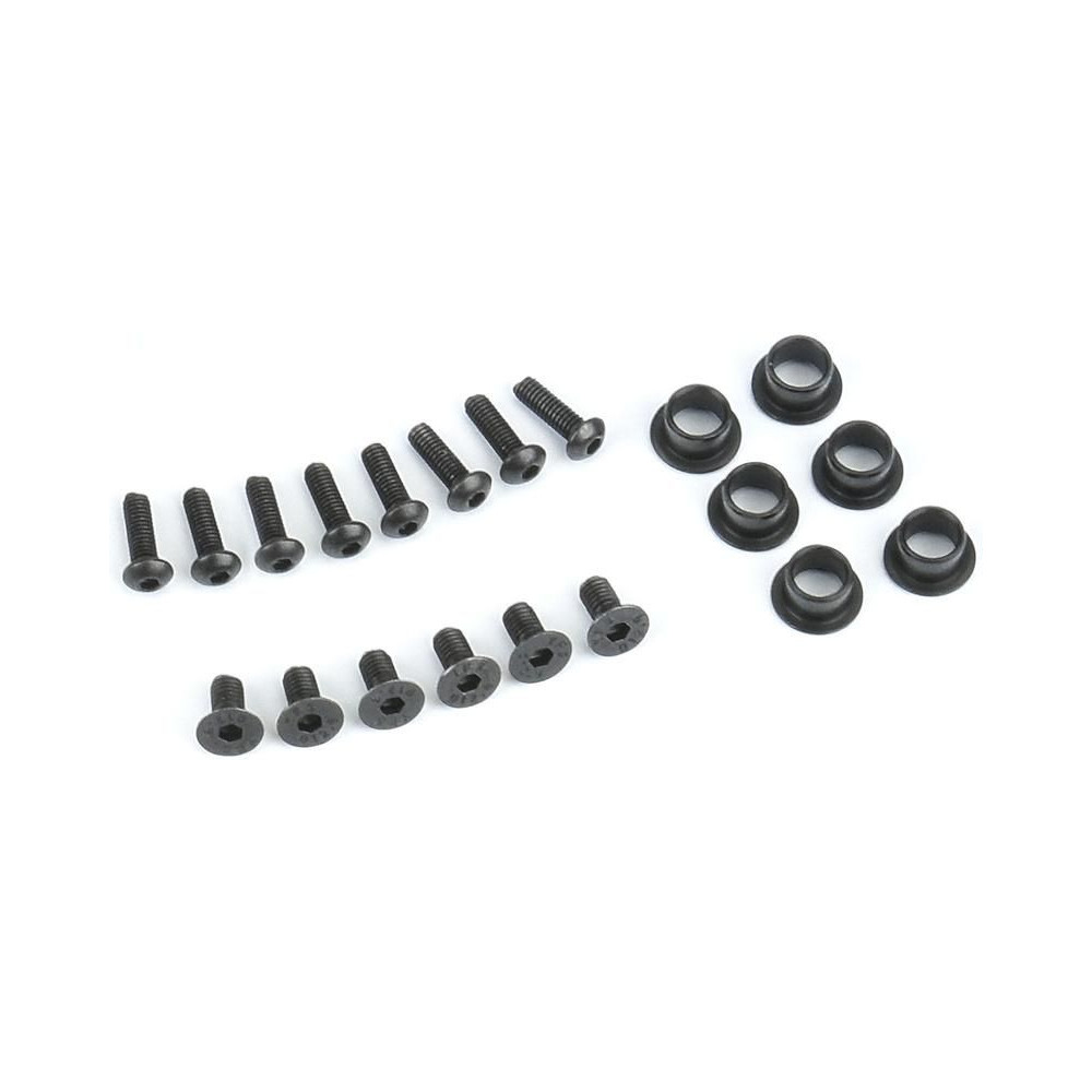Pro-Line első kerék tartozék Pro-Spec. 8 db M2,5x8 félgömbfejű csavar, 6 db M3x6 süllyesztett fejű csavar, 6 db rotorcsavar hüvely. Pro-Spec Promoto-SM kerék alkatrész.
