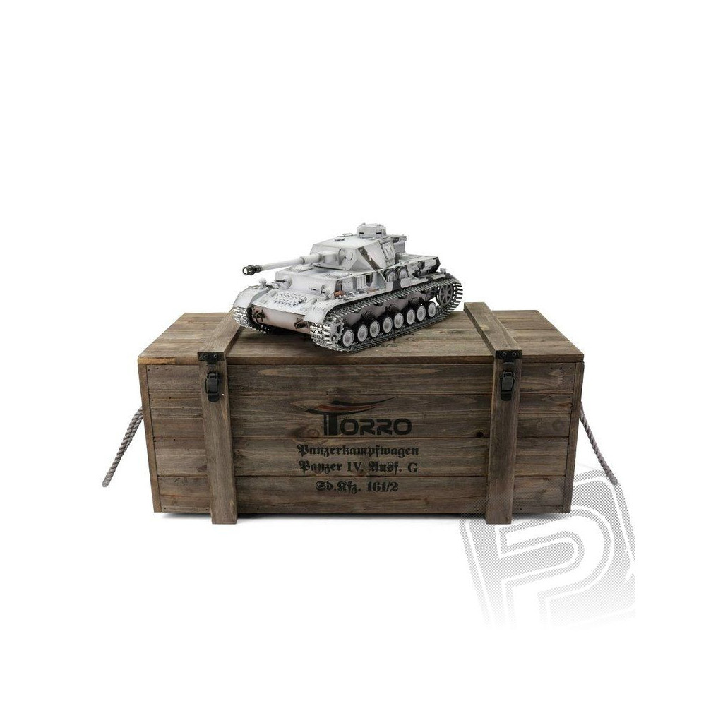 A mintegy öt kilogrammos tömegével a PzKpfw IV Ausf. G álcázás ideális az igényes vásárlók számára. A professzionális kiadásban kiváló airbrush festékminőséggel, 2,4 GHz-es áramköri technológiával és új hangszóróval rendelkezik. Ez a modell kiváló kezelési tulajdonságokkal, széleskörű funkciókkal és valósághű hangzással rendelkezik. A kiváló minőségű lánctalpak, a görgőkkel ellátott meghajtó- és vezetőkerekek, valamint az alsó hajótest és a harci torony fémből készültek. A sok apró alkatrész és a különböző matricák tökéletesen kiegészítik a mérethű másolatot.