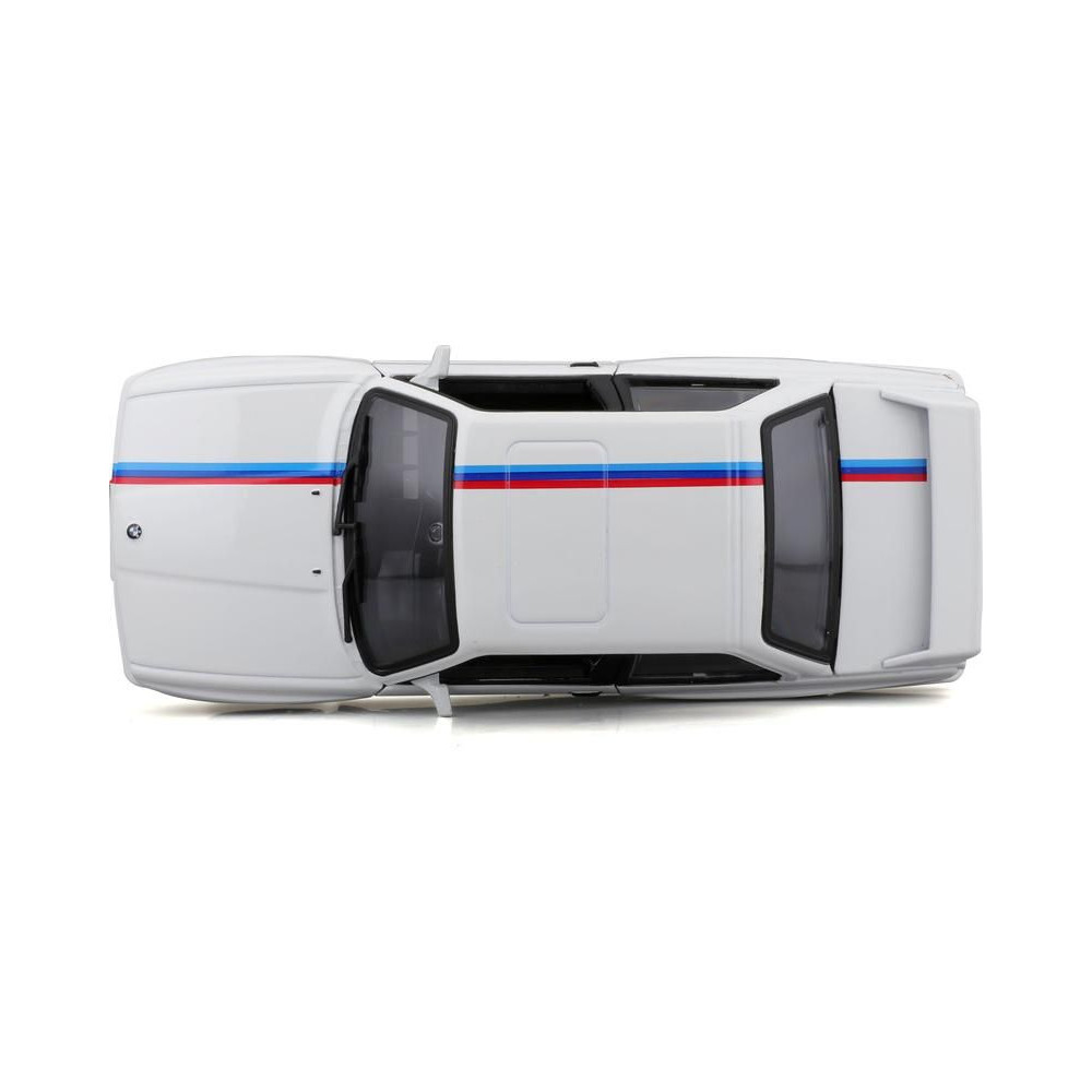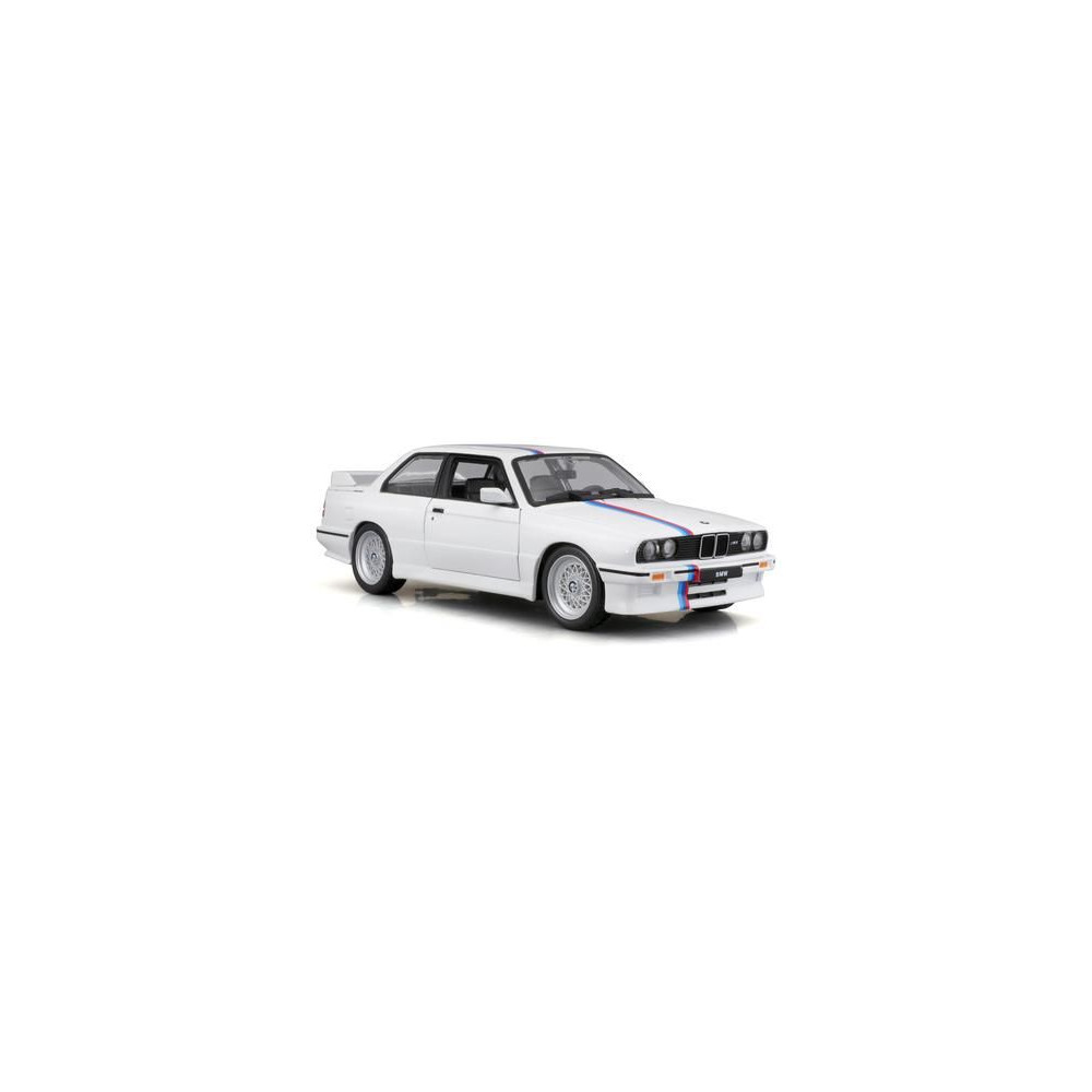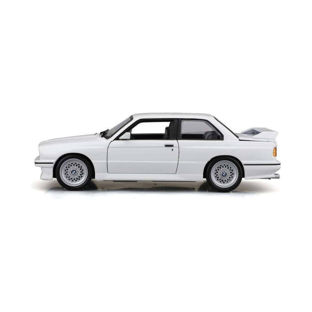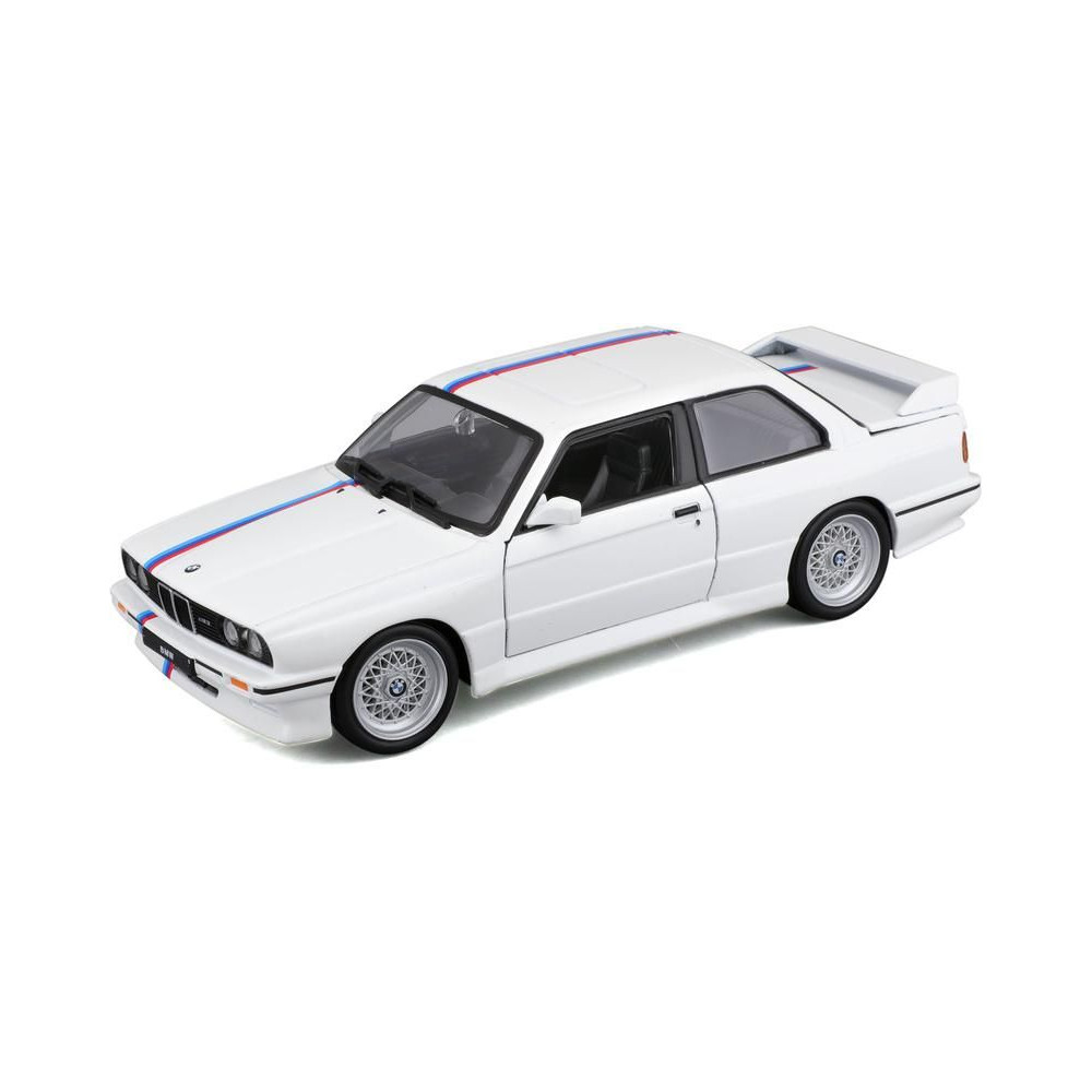 1:24-es fém autómodell Bburago 18-21100 BMW 3-as széria M3 1988 nem csak gyűjtőknek. Nyitóajtós, a modell színe fehér.